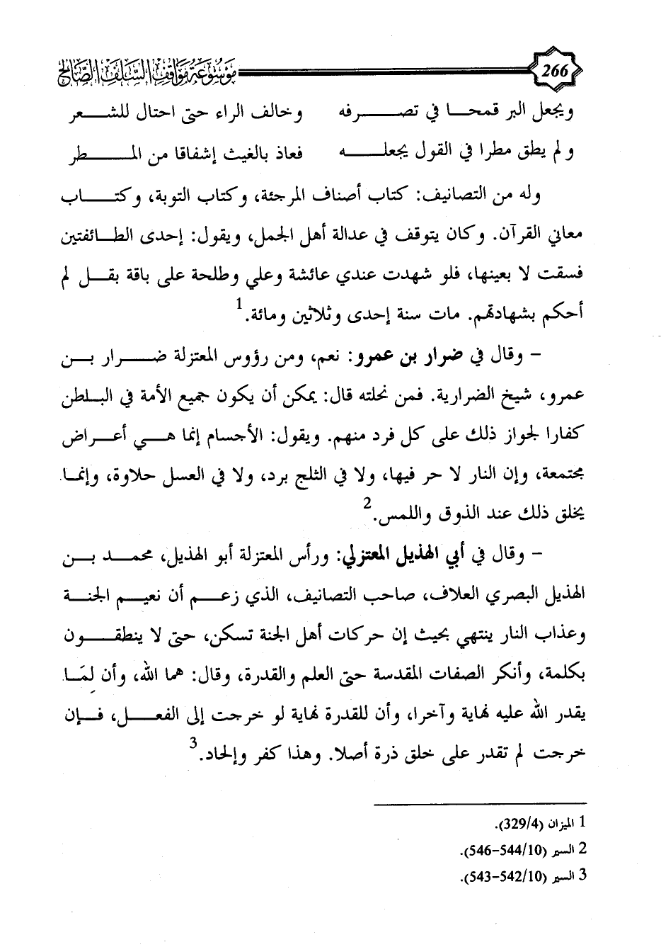 - وقال في أبي الهذيل المعتزلي: ورأس المعتزلة أبو الهذيل، محمد بن الهذيل البصري العلاف، صاحب التصانيف، الذي زعم أن نعيم الجنة وعذاب النار ينتهي بحيث إن حركات أهل الجنة تسكن، حتى لا ينطقون بكلمة، وأنكر الصفات المقدسة حتى العلم والقدرة، وقال: هما الله، وأن لِمَا يقدر الله عليه نهاية وآخرا، وأن للقدرة نهاية لو خرجت إلى الفعل، فإن خرجت لم تقدر على خلق ذرة أصلا. وهذا كفر وإلحاد. (¬3)