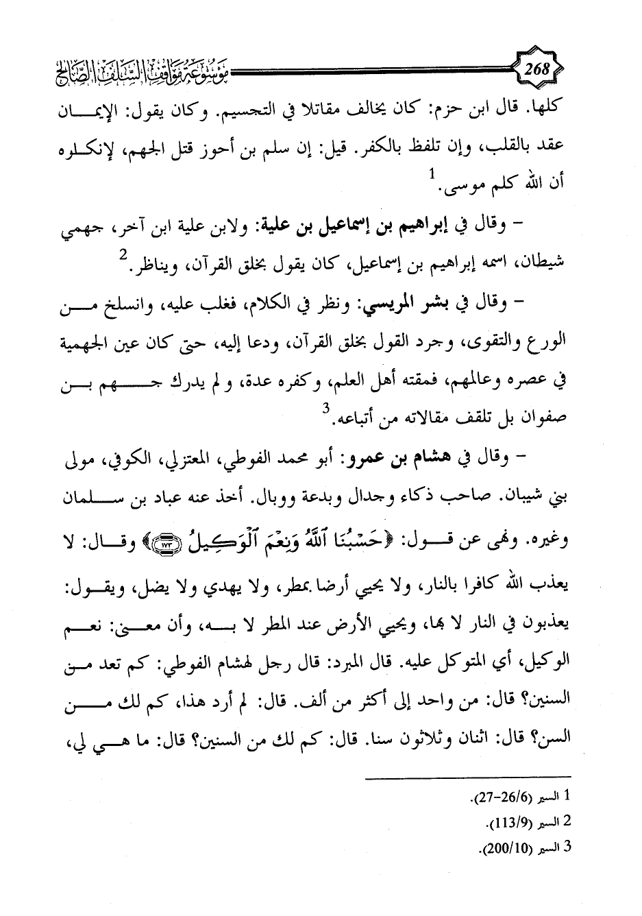 - وقال في بشر المريسي: ونظر في الكلام، فغلب عليه، وانسلخ من الورع والتقوى، وجرد القول بخلق القرآن، ودعا إليه، حتى كان عين الجهمية في عصره وعالمهم، فمقته أهل العلم، وكفره عدة، ولم يدرك جهم بن صفوان بل تلقف مقالاته من أتباعه. (¬3)