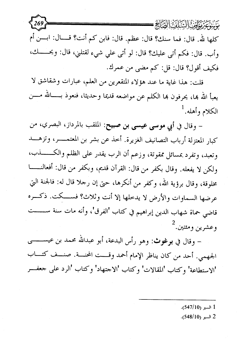 - وقال في برغوث: وهو رأس البدعة، أبو عبد الله محمد بن عيسى الجهمي. أحد من كان يناظر الإمام أحمد وقت المحنة. صنف كتاب 'الاستطاعة' وكتاب 'المقالات' وكتاب 'الاجتهاد' وكتاب 'الرد على جعفر
