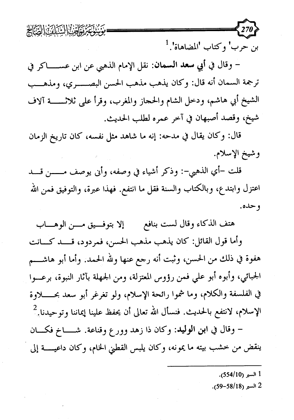 - وقال في أبي سعد السمان: نقل الإمام الذهبي عن ابن عساكر في ترجمة السمان أنه قال: وكان يذهب مذهب الحسن البصري، ومذهب الشيخ أبي هاشم، ودخل الشام والحجاز والمغرب، وقرأ على ثلاثة آلاف شيخ، وقصد أصبهان في آخر عمره لطلب الحديث.