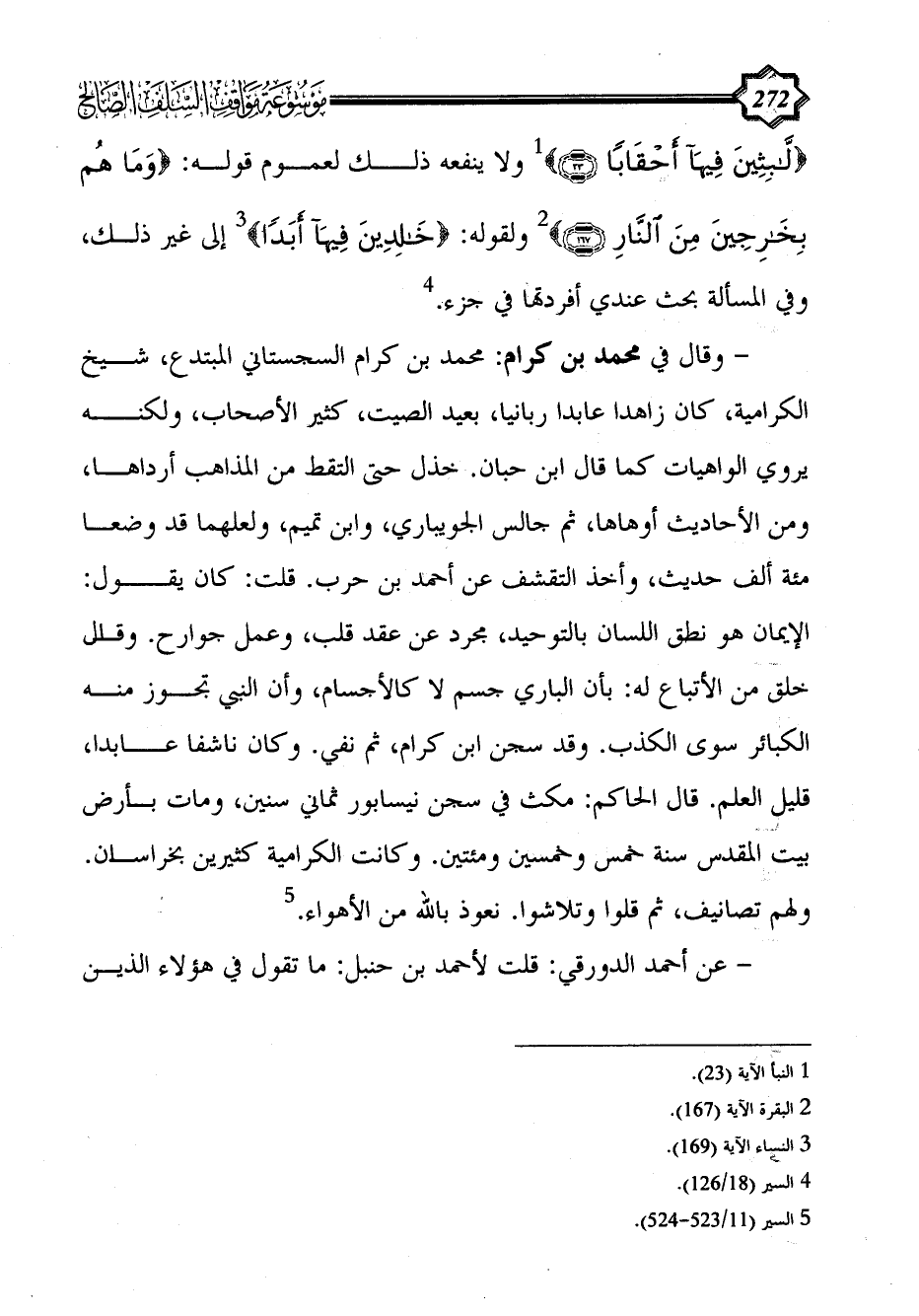 - وقال في محمد بن كرام: محمد بن كرام السجستاني المبتدع، شيخ الكرامية، كان زاهدا عابدا ربانيا، بعيد الصيت، كثير الأصحاب، ولكنه يروي الواهيات كما قال ابن حبان. خذل حتى التقط من المذاهب أرداها، ومن الأحاديث أوهاها، ثم جالس الجويباري، وابن تميم، ولعلهما قد وضعا مئة ألف حديث، وأخذ التقشف عن أحمد بن حرب. قلت: كان يقول: الإيمان هو نطق اللسان بالتوحيد، مجرد عن عقد قلب، وعمل جوارح. وقال خلق من الأتباع له: بأن الباري جسم لا كالأجسام، وأن النبي تجوز منه الكبائر سوى الكذب. وقد سجن ابن كرام، ثم نفي. وكان ناشفا عابدا، قليل العلم. قال الحاكم: مكث في سجن نيسابور ثماني سنين، ومات بأرض بيت المقدس سنة خمس وخمسين ومئتين. وكانت الكرامية كثيرين بخراسان. ولهم تصانيف، ثم قلوا وتلاشوا. نعوذ بالله من الأهواء. (¬5)