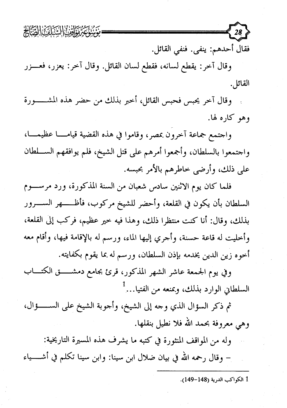 واجتمع جماعة آخرون بمصر، وقاموا في هذه القضية قياما عظيما، واجتمعوا بالسلطان، وأجمعوا أمرهم على قتل الشيخ، فلم يوافقهم السلطان على ذلك، وأرضى خاطرهم بالأمر بحبسه.