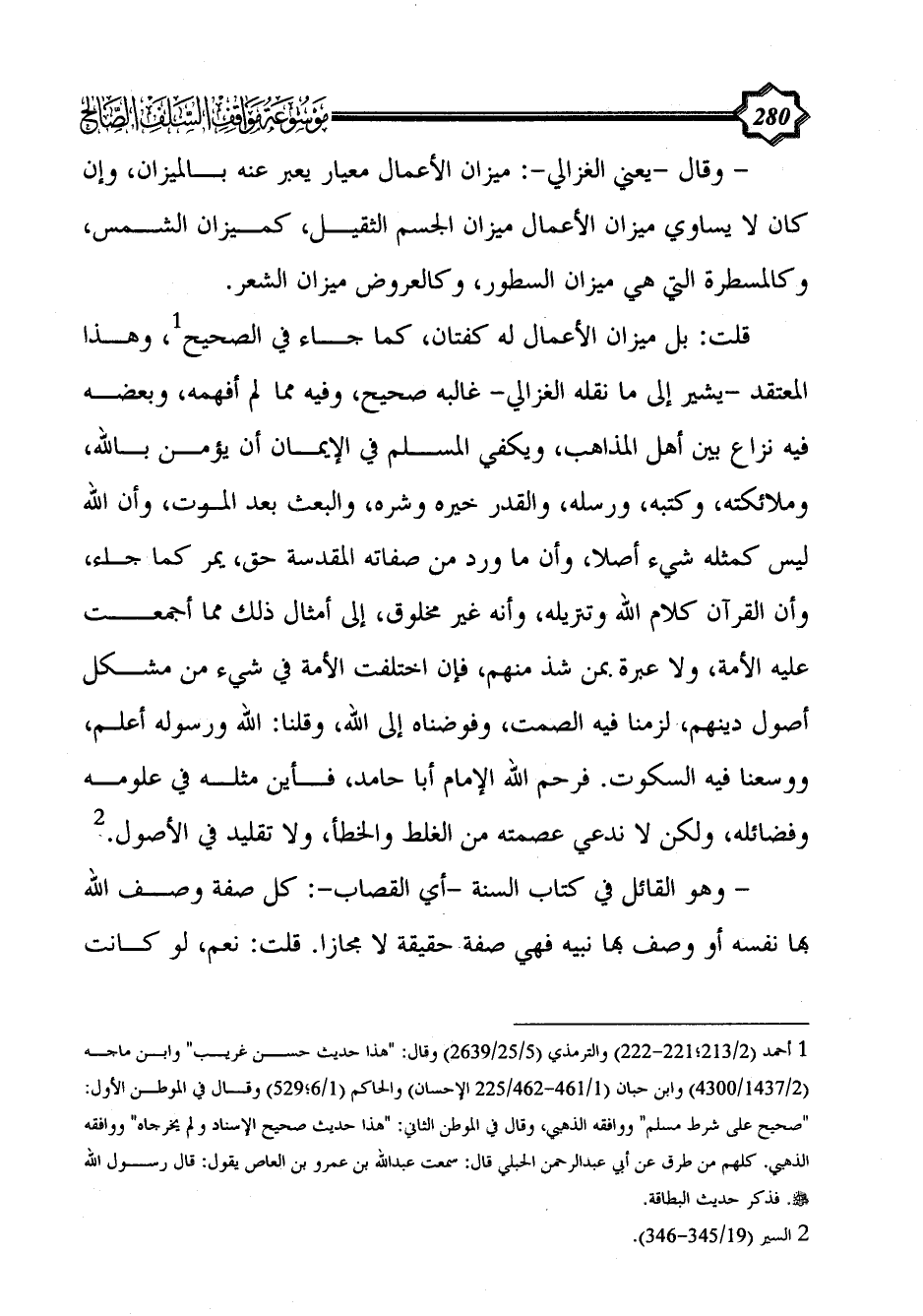 قلت: بل ميزان الأعمال له كفتان، كما جاء في الصحيح (¬1)، وهذا المعتقد -يشير إلى ما نقله الغزالي- غالبه صحيح، وفيه مما لم أفهمه، وبعضه فيه نزاع بين أهل المذاهب، ويكفي المسلم في الإيمان أن يؤمن بالله، وملائكته، وكتبه، ورسله، والقدر خيره وشره، والبعث بعد الموت، وأن الله ليس كمثله شيء أصلا، وأن ما ورد من صفاته المقدسة حق، يمر كما جاء، وأن القرآن كلام الله وتنزيله، وأنه غير مخلوق، إلى أمثال ذلك مما أجمعت عليه الأمة، ولا عبرة بمن شذ منهم، فإن اختلفت الأمة في شيء من مشكل أصول دينهم، لزمنا فيه الصمت، وفوضناه إلى الله، وقلنا: الله ورسوله أعلم، ووسعنا فيه السكوت. فرحم الله الإمام أبا حامد، فأين مثله في علومه وفضائله، ولكن لا ندعي عصمته من الغلط والخطأ، ولا تقليد في الأصول. (¬2)