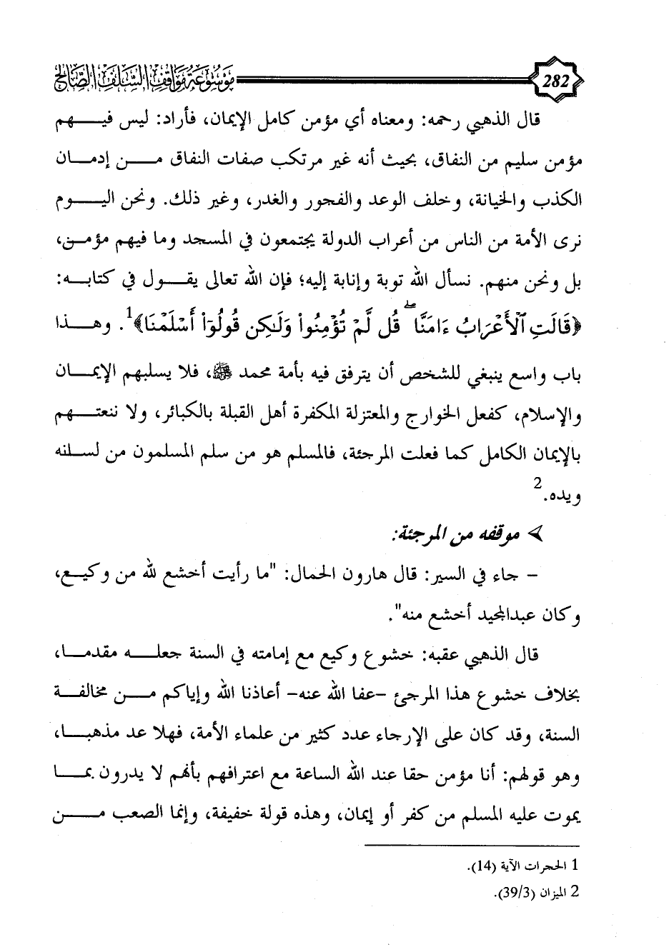 قال الذهبي عقبه: خشوع وكيع مع إمامته في السنة جعله مقدما، بخلاف خشوع هذا المرجئ -عفا الله عنه- أعاذنا الله وإياكم من مخالفة السنة، وقد كان على الإرجاء عدد كثير من علماء الأمة، فهلا عد مذهبا، وهو قولهم: أنا مؤمن حقا عند الله الساعة مع اعترافهم بأنهم لا يدرون بما يموت عليه المسلم من كفر أو إيمان، وهذه قولة خفيفة، وإنما الصعب من