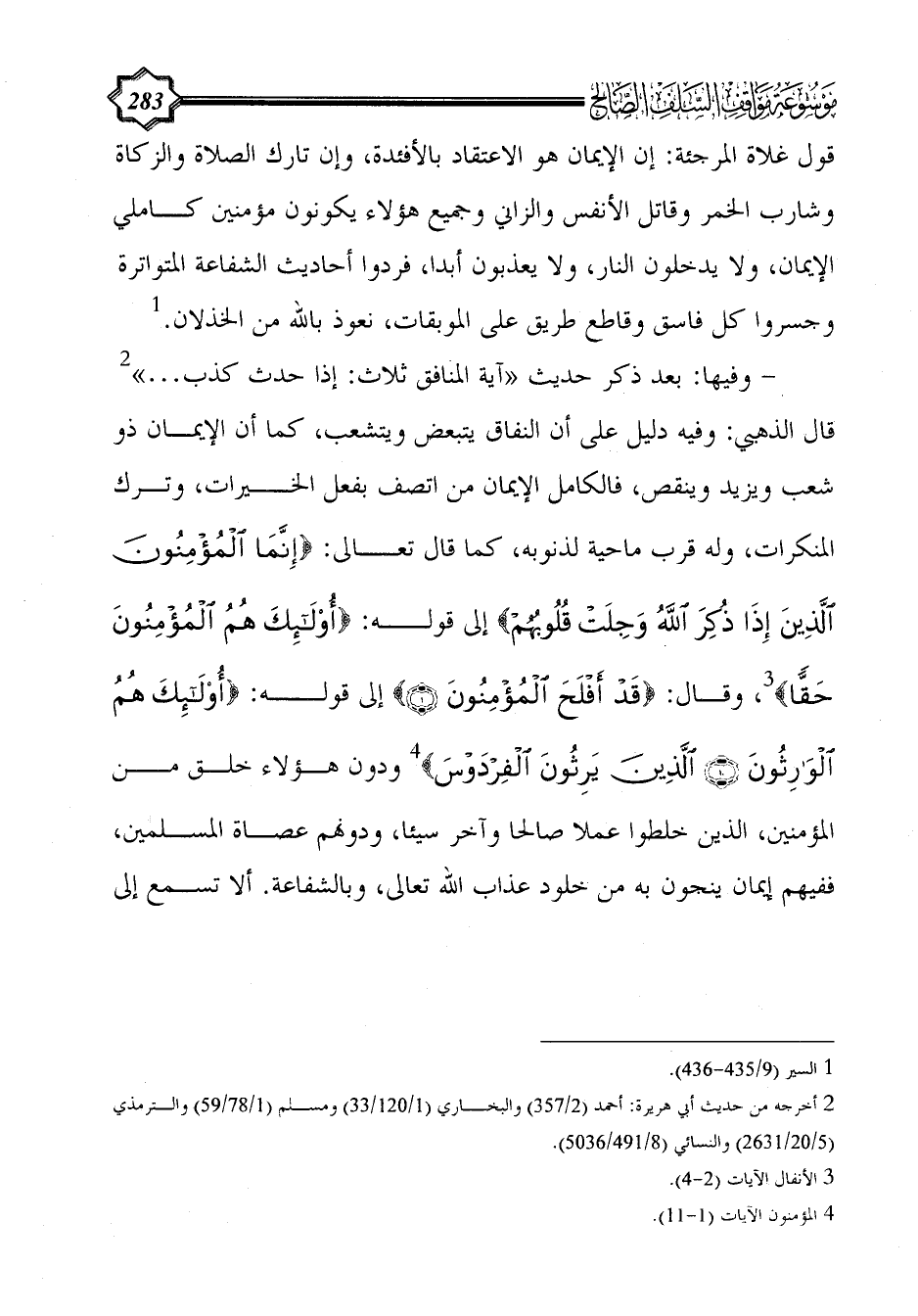 - وفيها: بعد ذكر حديث «آية المنافق ثلاث: إذا حدث كذب ... » (¬2) قال الذهبي: وفيه دليل على أن النفاق يتبعض ويتشعب، كما أن الإيمان ذو شعب ويزيد وينقص، فالكامل الإيمان من اتصف بفعل الخيرات، وترك المنكرات، وله قرب ماحية لذنوبه، كما قال تعالى: {إِنَّمَا الْمُؤْمِنُونَ الَّذِينَ إِذَا ذُكِرَ اللَّهُ وَجِلَتْ قُلُوبُهُمْ} إلى قوله: {أُولَئِكَ هُمُ الْمُؤْمِنُونَ حَقًّا} (¬3)، وقال: {قَدْ أَفْلَحَ الْمُؤْمِنُونَ (1)} إلى قوله: {أُولَئِكَ هُمُ الْوَارِثُونَ (10) الَّذِينَ يَرِثُونَ الْفِرْدَوْسَ} (¬4) ودون هؤلاء خلق من المؤمنين، الذين خلطوا عملا صالحا وآخر سيئا، ودونهم عصاة المسلمين، ففيهم إيمان ينجون به من خلود عذاب الله تعالى، وبالشفاعة. ألا تسمع إلى