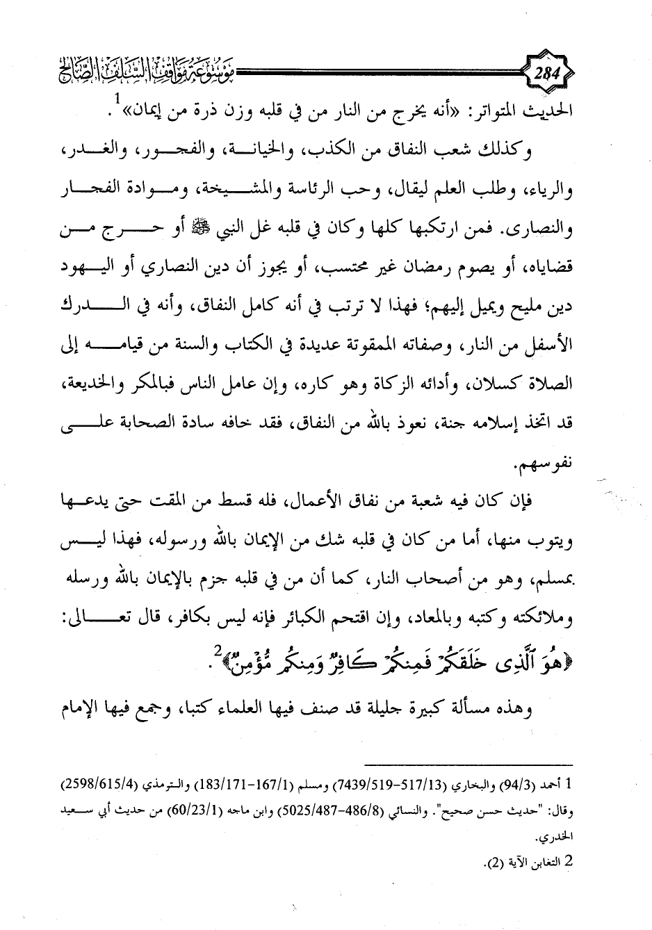 وكذلك شعب النفاق من الكذب، والخيانة، والفجور، والغدر، والرياء، وطلب العلم ليقال، وحب الرئاسة والمشيخة، وموادة الفجار والنصارى. فمن ارتكبها كلها وكان في قلبه غل النبي - صلى الله عليه وسلم - أو حرج من قضاياه، أو يصوم رمضان غير محتسب، أو يجوز أن دين النصاري أو اليهود دين مليح ويميل إليهم؛ فهذا لا ترتب في أنه كامل النفاق، وأنه في الدرك الأسفل من النار، وصفاته الممقوتة عديدة في الكتاب والسنة من قيامه إلى الصلاة كسلان، وأدائه الزكاة وهو كاره، وإن عامل الناس فبالمكر والخديعة، قد اتخذ إسلامه جنة، نعوذ بالله من النفاق، فقد خافه سادة الصحابة على نفوسهم.
