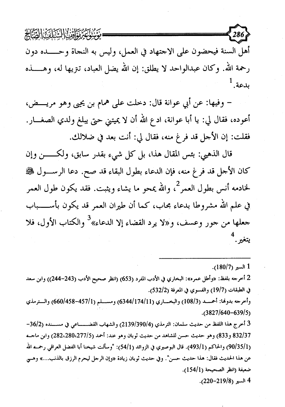 قال الذهبي: بئس المقال هذا، بل كل شيء بقدر سابق، ولكن وإن كان الأجل قد فرغ منه، فإن الدعاء بطول البقاء قد صح. دعا الرسول - صلى الله عليه وسلم - لخادمه أنس بطول العمر (¬2)،