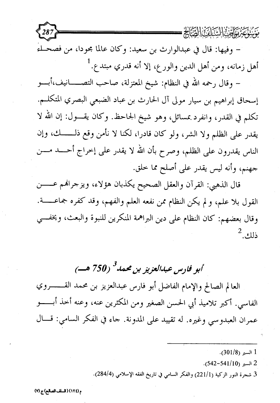 - وقال رحمه الله في النظام: شيخ المعتزلة، صاحب التصانيف، أبو إسحاق إبراهيم بن سيار مولى آل الحارث بن عباد الضبعي البصري المتكلم. تكلم في القدر، وانفرد بمسائل، وهو شيخ الجاحظ. وكان يقول: إن الله لا يقدر على الظلم ولا الشر، ولو كان قادرا، لكنا لا نأمن وقع ذلك، وإن الناس يقدرون على الظلم، وصرح بأن الله لا يقدر على إخراج أحد من جهنم، وأنه ليس يقدر على أصلح مما خلق.