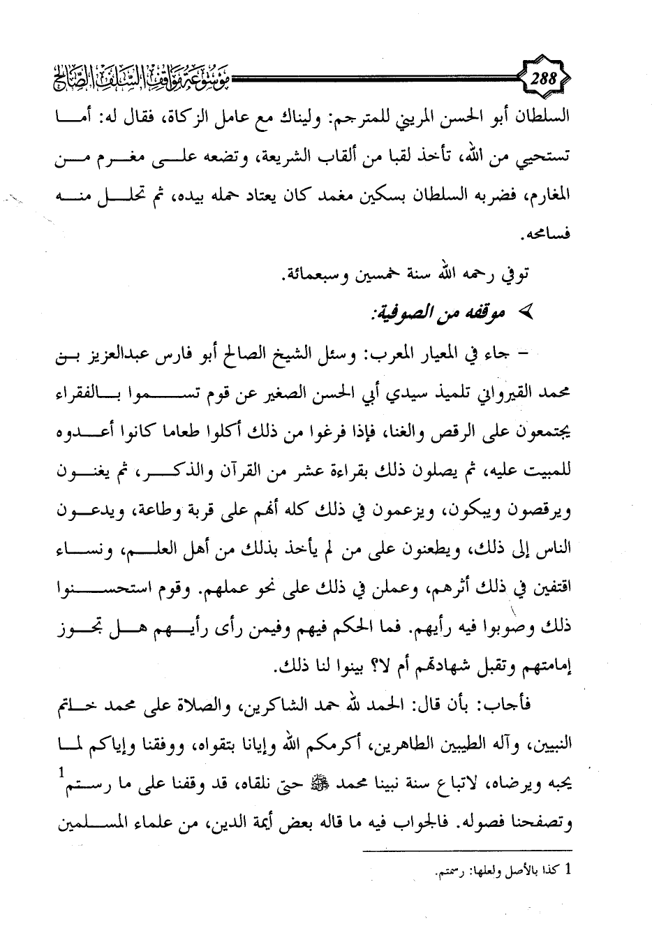 - جاء في المعيار المعرب: وسئل الشيخ الصالح أبو فارس عبد العزيز بن محمد القيرواني تلميذ سيدي أبي الحسن الصغير عن قوم تسموا بالفقراء يجتمعون على الرقص والغنا، فإذا فرغوا من ذلك أكلوا طعاما كانوا أعدوه للمبيت عليه، ثم يصلون ذلك بقراءة عشر من القرآن والذكر، ثم يغنون ويرقصون ويبكون، ويزعمون في ذلك كله أنهم على قربة وطاعة، ويدعون الناس إلى ذلك، ويطعنون على من لم يأخذ بذلك من أهل العلم، ونساء اقتفين في ذلك أثرهم، وعملن في ذلك على نحو عملهم. وقوم استحسنوا ذلك وصوبوا فيه رأيهم. فما الحكم فيهم وفيمن رأى رأيهم هل تجوز إمامتهم وتقبل شهادتهم أم لا؟ بينوا لنا ذلك.