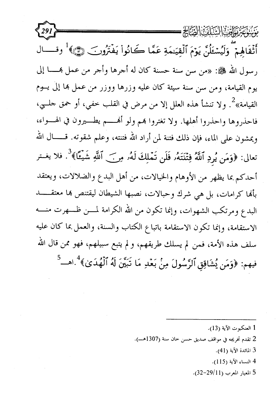 وقال رسول الله - صلى الله عليه وسلم -: «من سن سنة حسنة كان له أجرها وأجر من عمل بها إلى يوم القيامة، ومن سن سنة سيئة كان عليه وزرها ووزر من عمل بها إلى يوم القيامة» (¬2). ولا تنشأ هذه العلل إلا من مرض في القلب خفي، أو حمق جلي، فاحذروها واحذروا أهلها. ولا تغتروا بهم ولو أنهم يطيرون في الهواء، ويمشون على الماء، فإن ذلك فتنة لمن أراد الله فتنته، وعلم شقوته. قال الله تعالى: {وَمَنْ يُرِدِ اللَّهُ فِتْنَتَهُ فَلَنْ تَمْلِكَ لَهُ مِنَ اللَّهِ شَيْئًا} (¬3). فلا يغتر أحدكم بما يظهر من الأوهام والخيالات، من أهل البدع والضلالات، ويعتقد بأنها كرامات، بل هي شرك وحبالات، نصبها الشيطان ليقتنص بها معتقد البدع ومرتكب الشهوات، وإنما تكون من الله الكرامة لمن ظهرت منه الاستقامة، وإنما تكون الاستقامة باتباع الكتاب والسنة، والعمل بما كان عليه سلف هذه الأمة، فمن لم يسلك طريقهم، ولم يتبع سبيلهم، فهو ممن قال الله فيهم: {وَمَنْ يُشَاقِقِ الرَّسُولَ مِنْ بَعْدِ مَا تَبَيَّنَ لَهُ الْهُدَى} (¬4).اهـ (¬5)