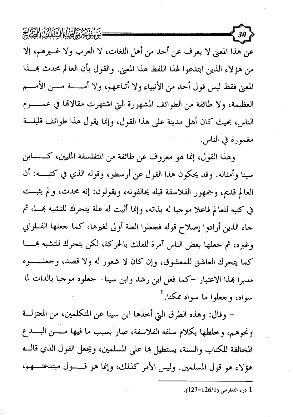 عن هذا المعنى لا يعرف عن أحد من أهل اللغات، لا العرب ولا غيرهم، إلا من هؤلاء الذين ابتدعوا لهذا اللفظ هذا المعنى. والقول بأن العالم محدث بهذا المعنى فقط ليس قول أحد من الأنبياء ولا أتباعهم، ولا أمة من الأمم العظيمة، ولا طائفة من الطوائف المشهورة التي اشتهرت مقالاتها في عموم الناس، بحيث كان أهل مدينة على هذا القول، وإنما يقول هذا طوائف قليلة مغمورة في الناس.