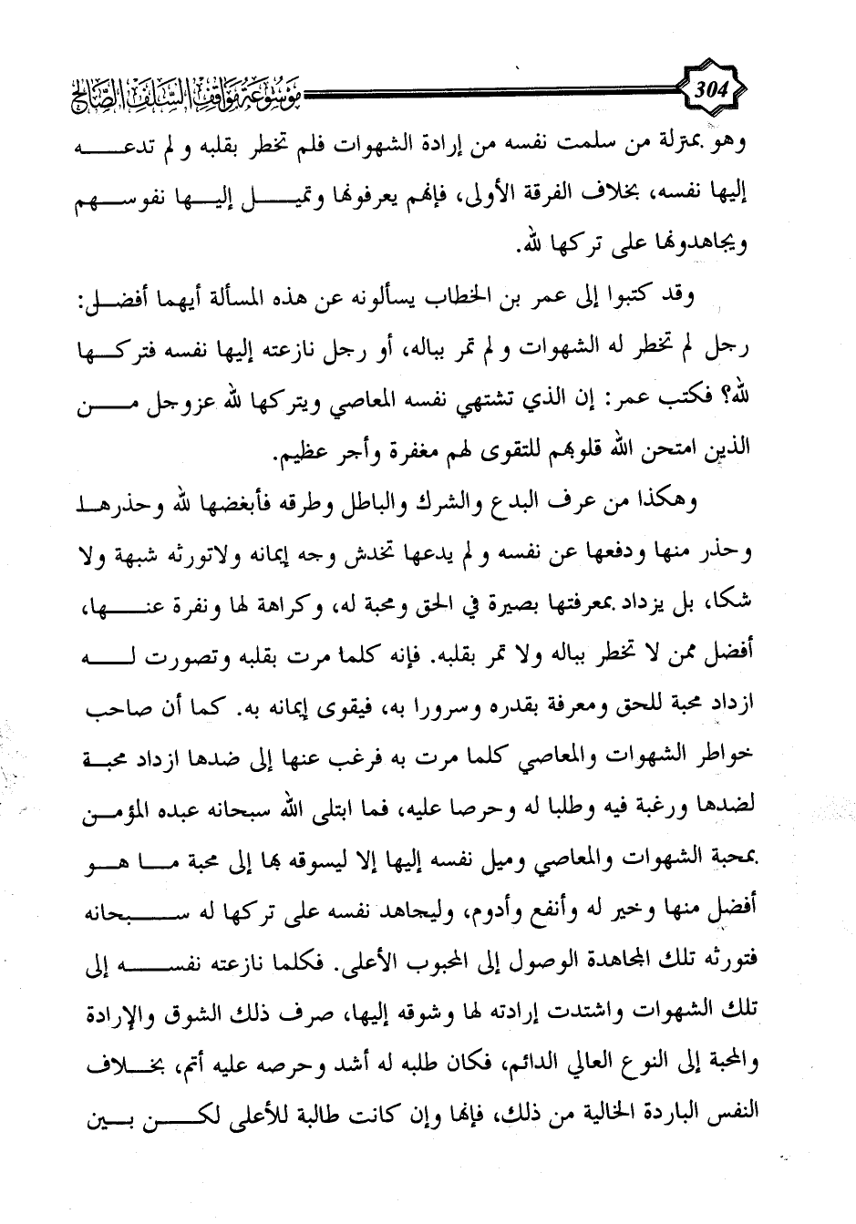 وقد كتبوا إلى عمر بن الخطاب يسألونه عن هذه المسألة أيهما أفضل: رجل لم تخطر له الشهوات ولم تمر بباله، أو رجل نازعته إليها نفسه فتركها لله؟ فكتب عمر: إن الذي تشتهي نفسه المعاصي ويتركها لله عزوجل من الذين امتحن الله قلوبهم للتقوى لهم مغفرة وأجر عظيم.