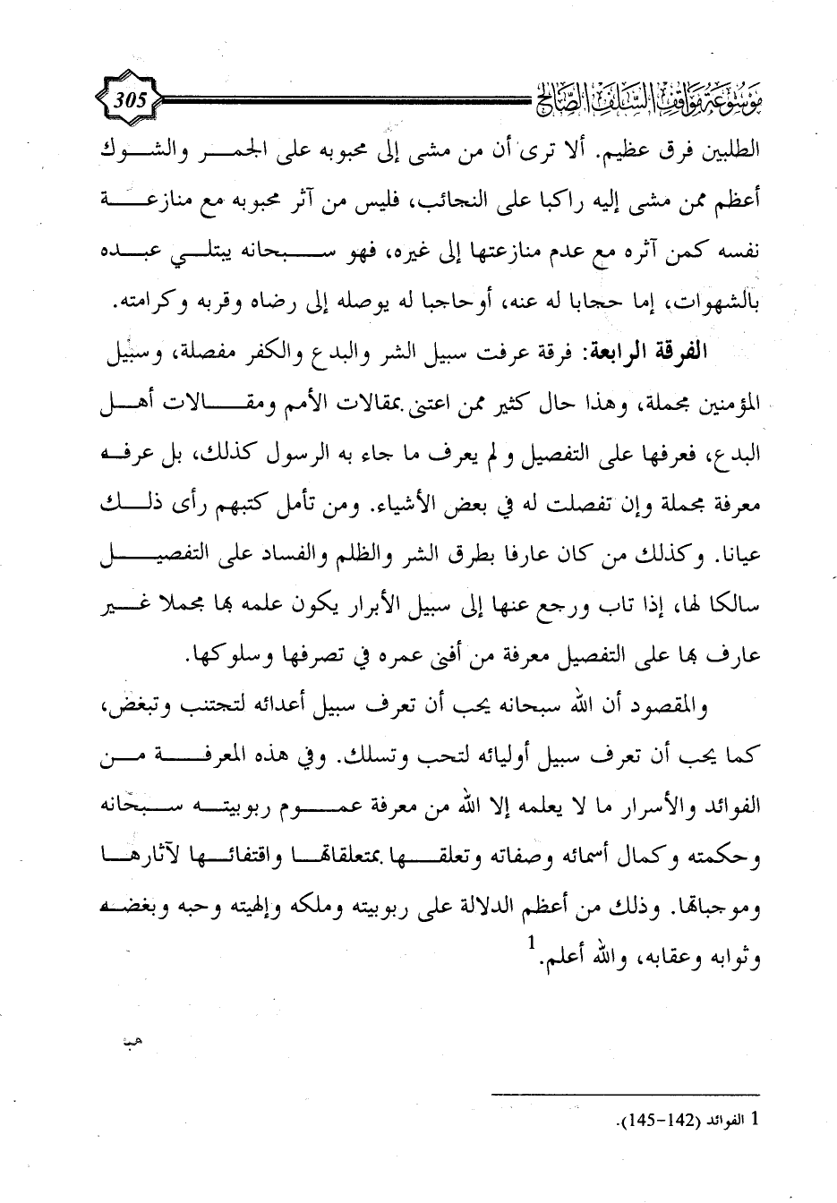 والمقصود أن الله سبحانه يحب أن تعرف سبيل أعدائه لتجتنب وتبغض، كما يحب أن تعرف سبيل أوليائه لتحب وتسلك. وفي هذه المعرفة من الفوائد والأسرار ما لا يعلمه إلا الله من معرفة عموم ربوبيته سبحانه وحكمته وكمال أسمائه وصفاته وتعلقها بمتعلقاتها واقتفائها لآثارها وموجباتها. وذلك من أعظم الدلالة على ربوبيته وملكه وإلهيته وحبه وبغضه وثوابه وعقابه، والله أعلم. (¬1)