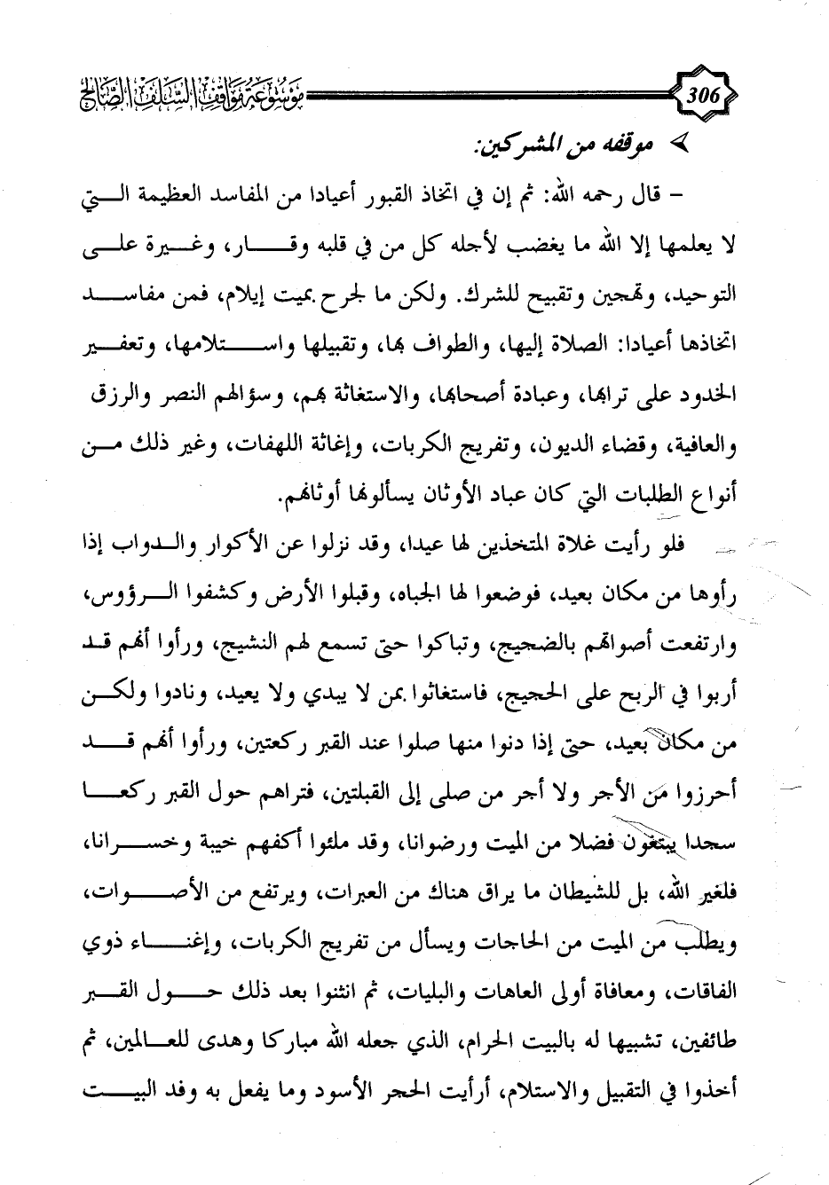 - قال رحمه الله: ثم إن في اتخاذ القبور أعيادا من المفاسد العظيمة التي لا يعلمها إلا الله ما يغضب لأجله كل من في قلبه وقار، وغيرة على التوحيد، وتهجين وتقبيح للشرك. ولكن ما لجرح بميت إيلام، فمن مفاسد اتخاذها أعيادا: الصلاة إليها، والطواف بها، وتقبيلها واستلامها، وتعفير الخدود على ترابها، وعبادة أصحابها، والاستغاثة بهم، وسؤالهم النصر والرزق والعافية، وقضاء الديون، وتفريج الكربات، وإغاثة اللهفات، وغير ذلك من أنواع الطلبات التي كان عباد الأوثان يسألونها أوثانهم.