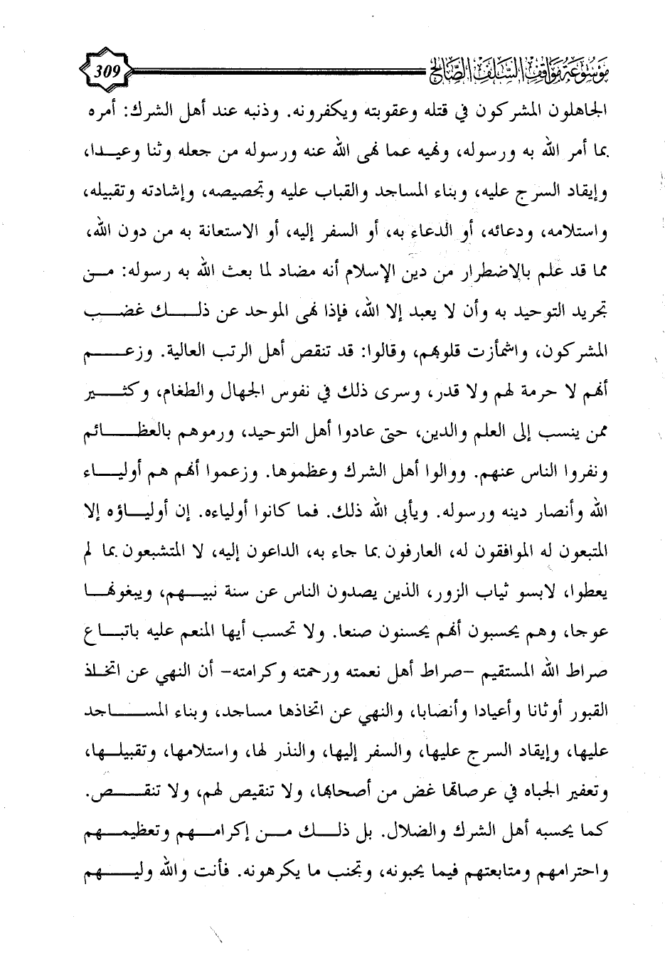 الجاهلون المشركون في قتله وعقوبته ويكفرونه. وذنبه عند أهل الشرك: أمره بما أمر الله به ورسوله، ونهيه عما نهى الله عنه ورسوله من جعله وثنا وعيدا، وإيقاد السرج عليه، وبناء المساجد والقباب عليه وتجصيصه، وإشادته وتقبيله، واستلامه، ودعائه، أو الدعاء به، أو السفر إليه، أو الاستعانة به من دون الله، مما قد علم بالاضطرار من دين الإسلام أنه مضاد لما بعث الله به رسوله: من تجريد التوحيد به وأن لا يعبد إلا الله، فإذا نهى الموحد عن ذلك غضب المشركون، واشمأزت قلوبهم، وقالوا: قد تنقص أهل الرتب العالية. وزعم أنهم لا حرمة لهم ولا قدر، وسرى ذلك في نفوس الجهال والطغام، وكثير ممن ينسب إلى العلم والدين، حتى عادوا أهل التوحيد، ورموهم بالعظائم ونفروا الناس عنهم. ووالوا أهل الشرك وعظموها. وزعموا أنهم هم أولياء الله وأنصار دينه ورسوله. ويأبى الله ذلك. فما كانوا أولياءه. إن أولياؤه إلا المتبعون له الموافقون له، العارفون بما جاء به، الداعون إليه، لا المتشبعون بما لم يعطوا، لابسو ثياب الزور، الذين يصدون الناس عن سنة نبيهم، ويبغونها عوجا، وهم يحسبون أنهم يحسنون صنعا. ولا تحسب أيها المنعم عليه باتباع صراط الله المستقيم -صراط أهل نعمته ورحمته وكرامته- أن النهي عن اتخاذ القبور أوثانا وأعيادا وأنصابا، والنهي عن اتخاذها مساجد، وبناء المساجد عليها، وإيقاد السرج عليها، والسفر إليها، والنذر لها، واستلامها، وتقبيلها، وتعفير الجباه في عرصاتها غض من أصحابها، ولا تنقيص لهم، ولا تنقص. كما يحسبه أهل الشرك والضلال. بل ذلك من إكرامهم وتعظيمهم واحترامهم ومتابعتهم فيما يحبونه، وتجنب ما يكرهونه.