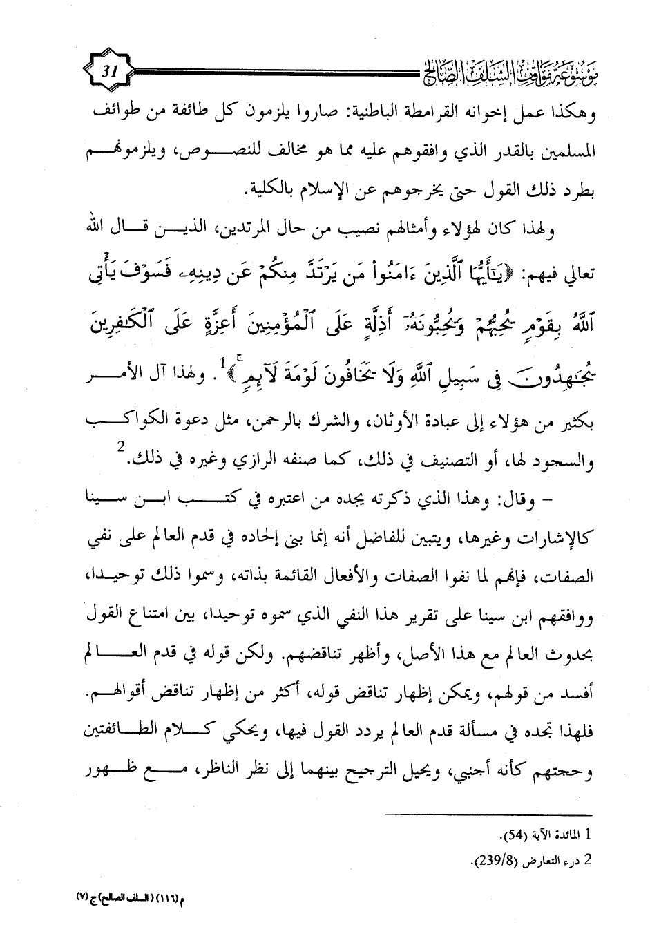 ولهذا كان لهؤلاء وأمثالهم نصيب من حال المرتدين، الذين قال الله تعالي فيهم: {يَا أَيُّهَا الَّذِينَ آَمَنُوا مَنْ يَرْتَدَّ مِنْكُمْ عَنْ دِينِهِ فَسَوْفَ يَأْتِي اللَّهُ بِقَوْمٍ يُحِبُّهُمْ وَيُحِبُّونَهُ أَذِلَّةٍ عَلَى الْمُؤْمِنِينَ أَعِزَّةٍ عَلَى الْكَافِرِينَ يُجَاهِدُونَ فِي سَبِيلِ اللَّهِ وَلَا يَخَافُونَ لَوْمَةَ لائم} (¬1). ولهذا آل الأمر بكثير من هؤلاء إلى عبادة الأوثان، والشرك بالرحمن، مثل دعوة الكواكب والسجود لها، أو التصنيف في ذلك، كما صنفه الرازي وغيره في ذلك. (¬2)