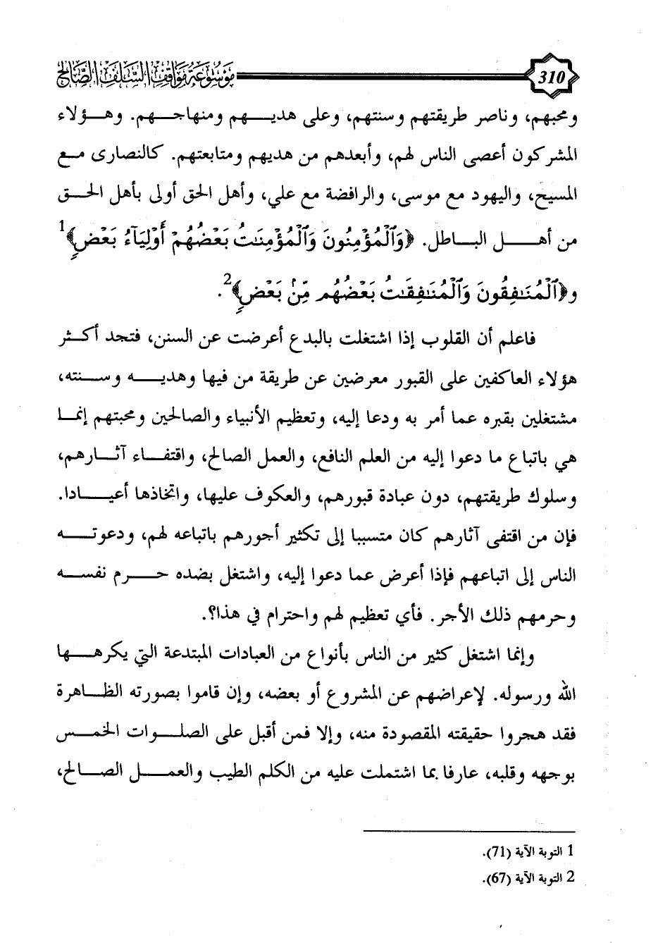 ومحبهم، وناصر طريقتهم وسنتهم، وعلى هديهم ومنهاجهم. وهؤلاء المشركون أعصى الناس لهم، وأبعدهم من هديهم ومتابعتهم. كالنصارى مع المسيح، واليهود مع موسى، والرافضة مع علي، وأهل الحق أولى بأهل الحق من أهل الباطل. {وَالْمُؤْمِنُونَ وَالْمُؤْمِنَاتُ بَعْضُهُمْ أَوْلِيَاءُ بَعْضٍ} (¬1) و {الْمُنَافِقُونَ وَالْمُنَافِقَاتُ بَعْضُهُمْ مِنْ بَعْضٍ} (¬2).