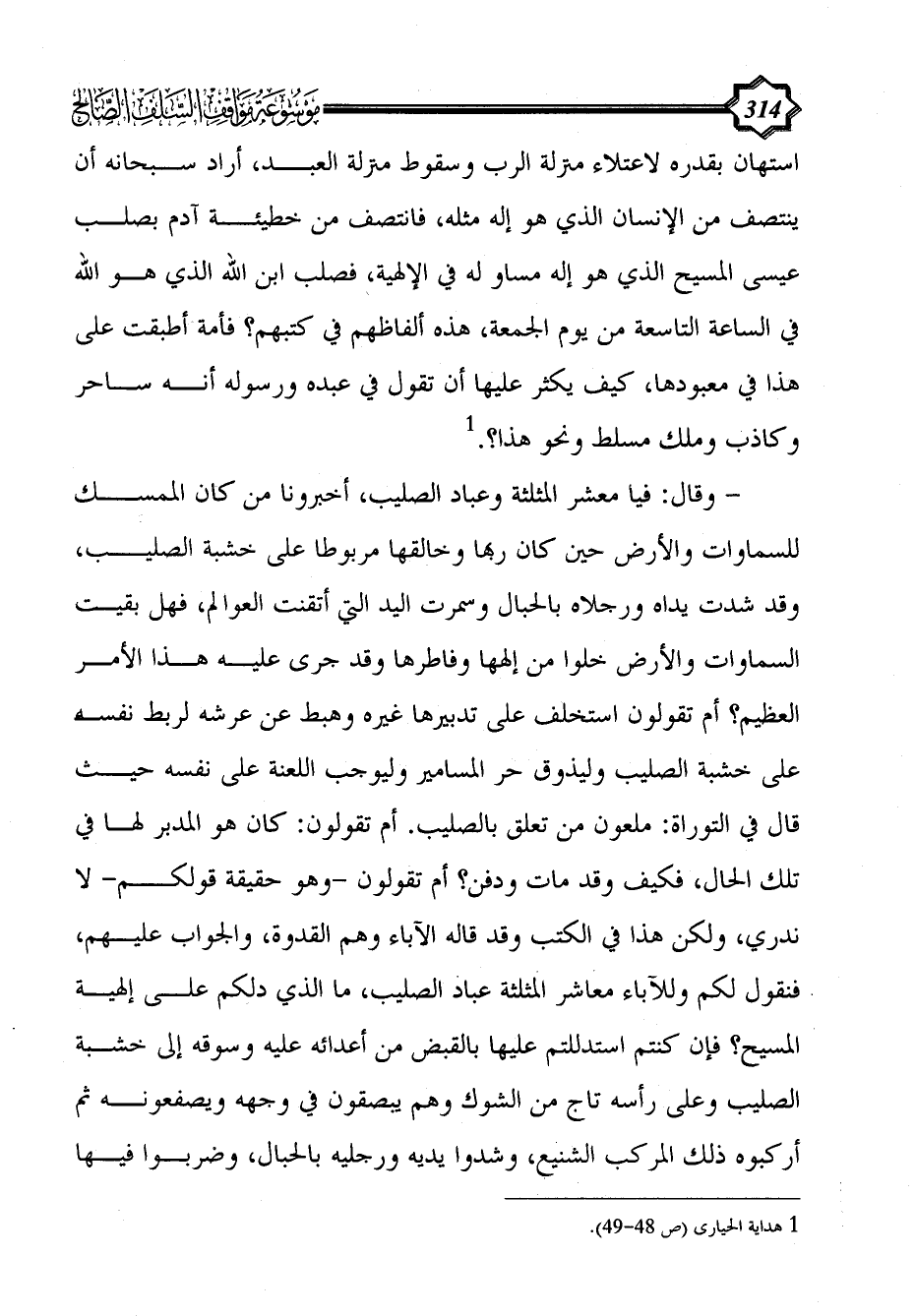 - وقال: فيا معشر المثلثة وعباد الصليب، أخبرونا من كان الممسك للسماوات والأرض حين كان ربها وخالقها مربوطا على خشبة الصليب، وقد شدت يداه ورجلاه بالحبال وسمرت اليد التي أتقنت العوالم، فهل بقيت السماوات والأرض خلوا من إلهها وفاطرها وقد جرى عليه هذا الأمر العظيم؟ أم تقولون استخلف على تدبيرها غيره وهبط عن عرشه لربط نفسه على خشبة الصليب وليذوق حر المسامير وليوجب اللعنة على نفسه حيث قال في التوراة: ملعون من تعلق بالصليب. أم تقولون: كان هو المدبر لها في تلك الحال، فكيف وقد مات ودفن؟ أم تقولون -وهو حقيقة قولكم- لا ندري، ولكن هذا في الكتب وقد قاله الآباء وهم القدوة، والجواب عليهم، فنقول لكم وللآباء معاشر المثلثة عباد الصليب، ما الذي دلكم على إلهية المسيح؟ فإن كنتم استدللتم عليها بالقبض من أعدائه عليه وسوقه إلى خشبة الصليب وعلى رأسه تاج من الشوك وهم يبصقون في وجهه ويصفعونه ثم أركبوه ذلك المركب الشنيع، وشدوا يديه ورجليه بالحبال، وضربوا فيها