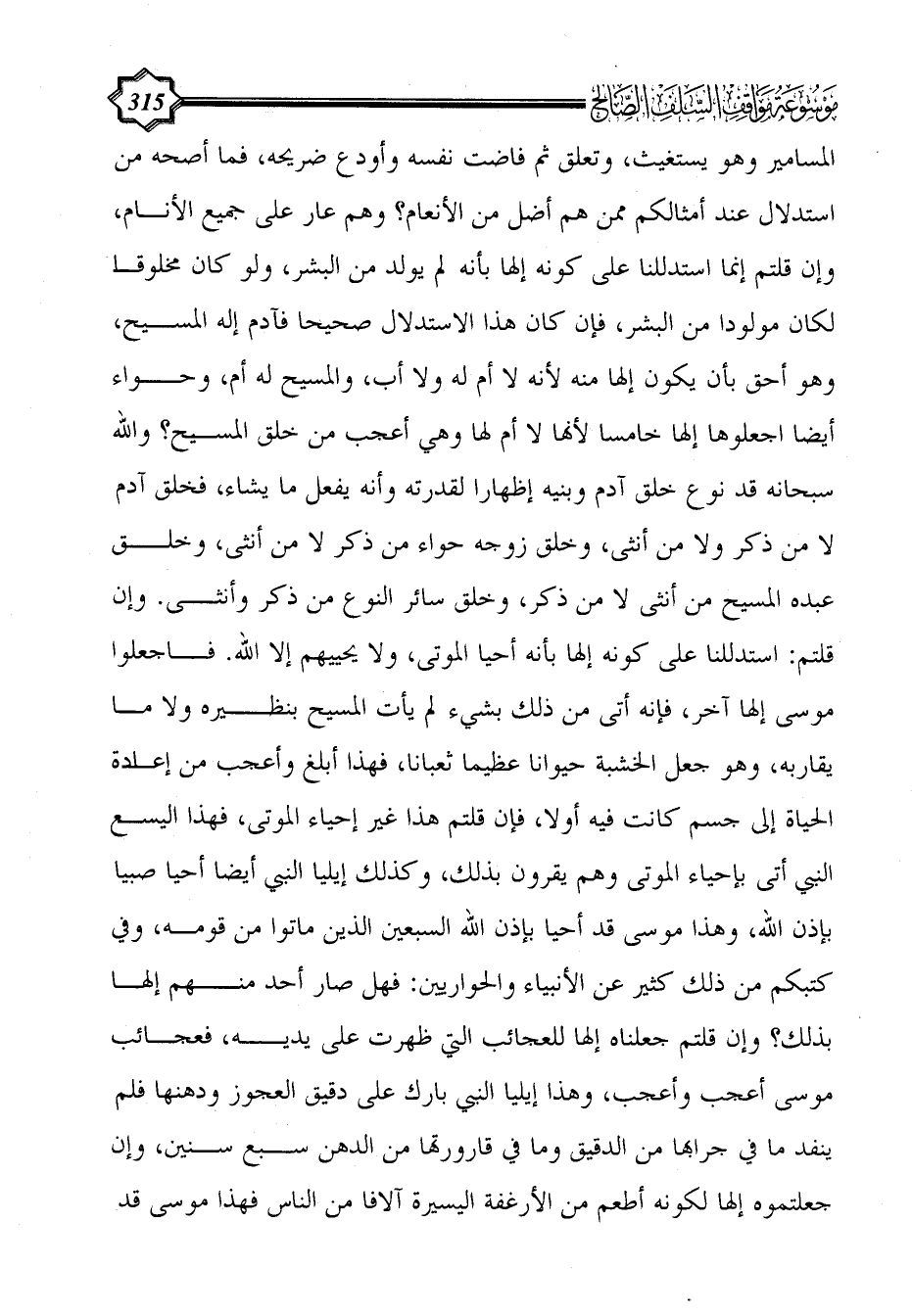 فاجعلوا موسى إلها آخر، فإنه أتى من ذلك بشيء لم يأت المسيح بنظيره ولا ما يقاربه، وهو جعل الخشبة حيوانا عظيما ثعبانا، فهذا أبلغ وأعجب من إعادة الحياة إلى جسم كانت فيه أولا، فإن قلتم هذا غير إحياء الموتى، فهذا اليسع النبي أتى بإحياء الموتى وهم يقرون بذلك، وكذلك إيليا النبي أيضا أحيا صبيا بإذن الله، وهذا موسى قد أحيا بإذن الله السبعين الذين ماتوا من قومه، وفي كتبكم من ذلك كثير عن الأنبياء والحواريين: فهل صار أحد منهم إلها بذلك؟ وإن قلتم جعلناه إلها للعجائب التي ظهرت على يديه، فعجائب موسى أعجب وأعجب، وهذا إيليا النبي بارك على دقيق العجوز ودهنها فلم ينفد ما في جرابها من الدقيق وما في قارورتها من الدهن سبع سنين، وإن جعلتموه إلها لكونه أطعم من الأرغفة اليسيرة آلافا من الناس فهذا موسى قد