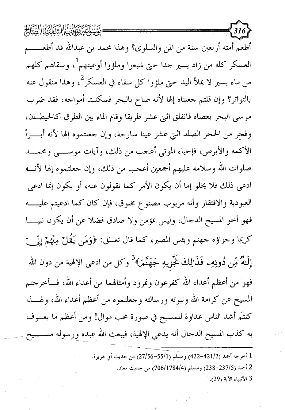 وهذا منقول عنه بالتواتر؟ وإن قلتم جعلناه إلها لأنه صاح بالبحر فسكنت أمواجه، فقد ضرب موسى البحر بعصاه فانفلق اثنى عشر طريقا وقام الماء بين الطرق كالحيطان، وفجر من الحجر الصلد اثني عشر عينا سارحة، وإن جعلتموه إلها لأنه أبرأ الأكمه والأبرص، فإحياء الموتى أعجب من ذلك، وآيات موسى ومحمد صلوات الله وسلامه عليهم أجمعين أعجب من ذلك، وإن جعلتموه إلها لأنه ادعى ذلك فلا يخلو إما أن يكون الأمر كما تقولون عنه، أو يكون إنما ادعى العبودية والافتقار وأنه مربوب مصنوع مخلوق، فإن كان كما ادعيتم عليه فهو أخو المسيح الدجال، وليس بمؤمن ولا صادق فضلا عن أن يكون نبيا كريما وجزاؤه جهنم وبئس المصير، كما قال تعالى: {وَمَنْ يَقُلْ مِنْهُمْ إِنِّي إِلَهٌ مِنْ دُونِهِ فَذَلِكَ نَجْزِيهِ جَهَنَّمَ} (¬3) وكل من ادعى الإلهية من دون الله فهو من أعظم أعداء الله كفرعون ونمرود وأمثالهما من أعداء الله، فأخرجتم المسيح عن كرامة الله ونبوته ورسالته وجعلتموه من أعظم أعداء الله، ولهذا كنتم أشد الناس عداوة للمسيح في صورة محب موال! ومن أعظم ما يعرف به كذب المسيح الدجال أنه يدعي الإلهية، فيبعث الله عبده ورسوله مسيح