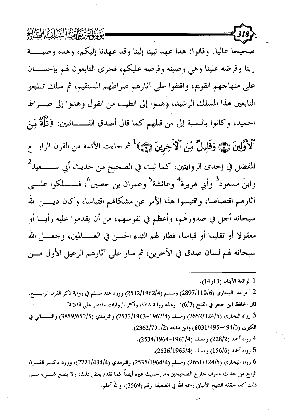صحيحا عاليا. وقالوا: هذا عهد نبينا إلينا وقد عهدنا إليكم، وهذه وصية ربنا وفرضه علينا وهي وصيته وفرضه عليكم، فجرى التابعون لهم بإحسان على منهاجهم القويم، واقتفوا على آثارهم صراطهم المستقيم، ثم سلك تابعو التابعين هذا المسلك الرشيد، وهدوا إلى الطيب من القول وهدوا إلى صراط الحميد، وكانوا بالنسبة إلى من قبلهم كما قال أصدق القائلين: {ثُلَّةٌ مِنَ الْأَوَّلِينَ (13) وَقَلِيلٌ مِنَ الْآَخِرِينَ (14)} (¬1) ثم جاءت الأئمة من القرن الرابع المفضل في إحدى الروايتين، كما ثبت في الصحيح من حديث أبي سعيد (¬2) وابن مسعود (¬3)