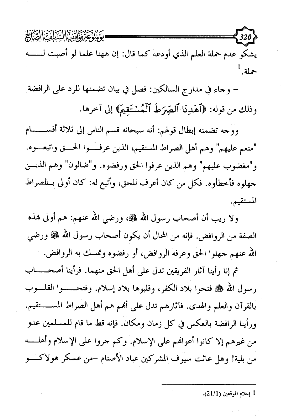 - وجاء في مدارج السالكين: فصل في بيان تضمنها للرد على الرافضة وذلك من قوله: {اهْدِنَا الصِّرَاطَ الْمُسْتَقِيمَ} إلى آخرها.