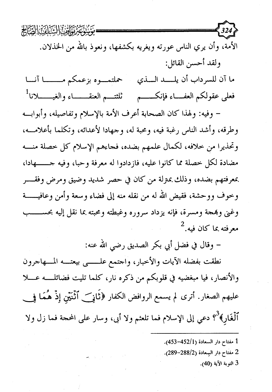 نطقت بفضله الآيات والأخبار، واجتمع على بيعته المهاجرون والأنصار، فيا مبغضيه في قلوبكم من ذكره نار، كلما تليت فضائله علا عليهم الصغار. أترى لم يسمع الروافض الكفار {ثَانِيَ اثْنَيْنِ إِذْ هُمَا فِي الْغَارِ} (¬3)؟ دعي إلى الإسلام فما تلعثم ولا أبى، وسار على المحجة فما زل ولا