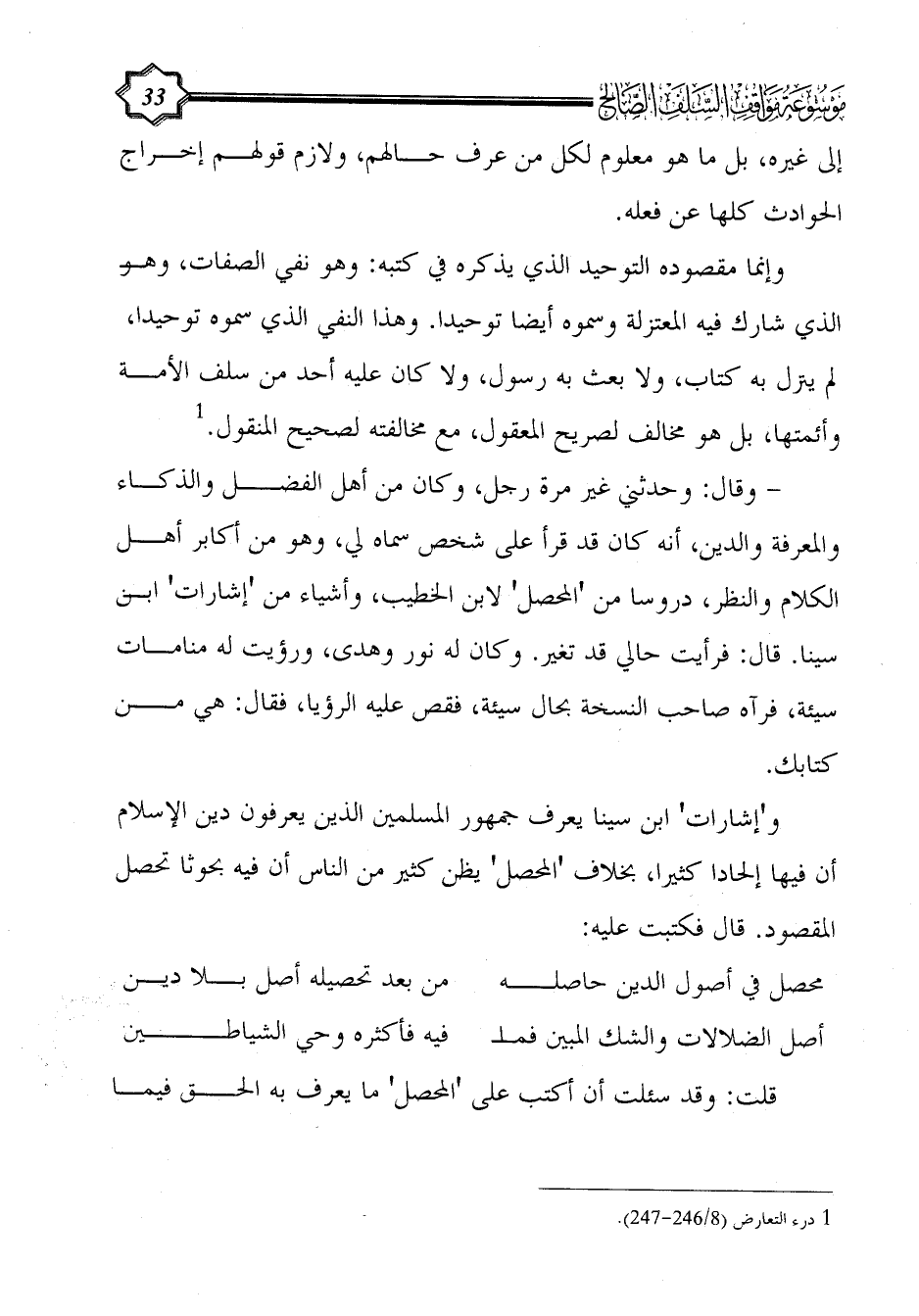 و'إشارات' ابن سينا يعرف جمهور المسلمين الذين يعرفون دين الإسلام أن فيها إلحادا كثيرا، بخلاف 'المحصل' يظن كثير من الناس أن فيه بحوثا تحصل المقصود. قال فكتبت عليه: