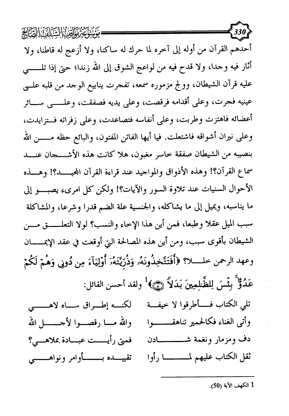 أحدهم القرآن من أوله إلى آخره لما حرك له ساكنا، ولا أزعج له قاطنا، ولا أثار فيه وجدا، ولا قدح فيه من لواعج الشوق إلى الله زندا؛ حتى إذا تلي عليه قرآن الشيطان، وولج مزموره سمعه، تفجرت ينابيع الوجد من قلبه على عينيه فجرت، وعلى أقدامه فرقصت، وعلى يديه فصفقت، وعلى سائر أعضائه فاهتزت وطربت، وعلى أنفاسه فتصاعدت، وعلى زفراته فتزايدت، وعلى نيران أشواقه فاشتعلت. فيا أيها الفاتن المفتون، والبائع حظه من الله بنصيبه من الشيطان صفقة خاسر مغبون، هلا كانت هذه الأشجان عند سماع القرآن؟! وهذه الأذواق والمواجيد عند قراءة القرآن المجيد؟! وهذه الأحوال السنيات عند تلاوة السور والآيات؟! ولكن كل امرىء يصبو إلى ما يناسبه، ويميل إلى ما يشاكله، والجنسية علة الضم قدرا وشرعا، والمشاكلة سبب الميل عقلا وطبعا، فمن أين هذا الإخاء والنسب؟ لولا التعلق من الشيطان بأقوى سبب، ومن أين هذه المصالحة التي أوقعت في عقد الإيمان وعهد الرحمن خللا؟ {أَفَتَتَّخِذُونَهُ وَذُرِّيَّتَهُ أَوْلِيَاءَ مِنْ دُونِي وَهُمْ لَكُمْ عَدُوٌّ بِئْسَ لِلظَّالِمِينَ بَدَلًا (50)} (¬1) ولقد أحسن القائل: