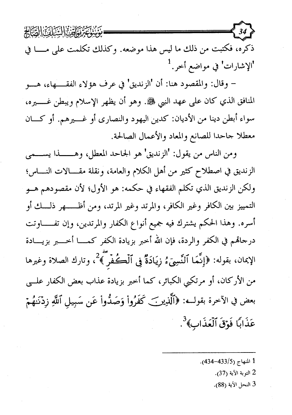 ومن الناس من يقول: 'الزنديق' هو الجاحد المعطل، وهذا يسمى الزنديق في اصطلاح كثير من أهل الكلام والعامة، ونقلة مقالات الناس؛ ولكن الزنديق الذي تكلم الفقهاء في حكمه: هو الأول؛ لأن مقصودهم هو التمييز بين الكافر وغير الكافر، والمرتد وغير المرتد، ومن أظهر ذلك أو أسره. وهذا الحكم يشترك فيه جميع أنواع الكفار والمرتدين، وإن تفاوتت درجاتهم في الكفر والردة، فإن الله أخبر بزيادة الكفر كما أخبر بزيادة الإيمان، بقوله: {إِنَّمَا النَّسِيءُ زِيَادَةٌ فِي الْكُفْرِ} (¬2)، وتارك الصلاة وغيرها من الأركان، أو مرتكبي الكبائر، كما أخبر بزيادة عذاب بعض الكفار على بعض في الآخرة بقوله: {الَّذِينَ كَفَرُوا وَصَدُّوا عَنْ سَبِيلِ اللَّهِ زِدْنَاهُمْ عَذَابًا فَوْقَ الْعَذَابِ} (¬3).