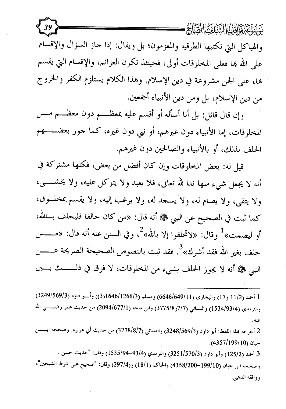 قيل له: بعض المخلوقات وإن كان أفضل من بعض، فكلها مشتركة في أنه لا يجعل شيء منها ندا لله تعالى، فلا يعبد ولا يتوكل عليه، ولا يخشى، ولا يتقى، ولا يصام له، ولا يسجد له، ولا يرغب إليه، ولا يقسم بمخلوق، كما ثبت في الصحيح عن النبي - صلى الله عليه وسلم - أنه قال: «من كان حالفا فليحلف بالله، أو ليصمت» (¬1) وقال: «لاتحلفوا إلا بالله» (¬2)، وفي السنن عنه أنه قال: «من حلف بغير الله فقد أشرك» (¬3).