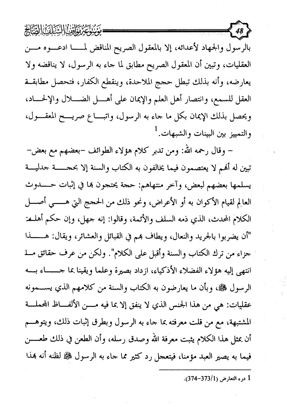 - وقال رحمه الله: ومن تدبر كلام هؤلاء الطوائف -بعضهم مع بعض- تبين له أنهم لا يعتصمون فيما يخالفون به الكتاب والسنة إلا بحجة جدلية يسلمها بعضهم لبعض، وآخر منتهاهم: حجة يحتجون بها في إثبات حدوث العالم لقيام الأكوان به أو الأعراض، ونحو ذلك من الحجج التي هي أصل الكلام المحدث، الذي ذمه السلف والأئمة، وقالوا: إنه جهل، وإن حكم أهله: "أن يضربوا بالجريد والنعال، ويطاف بهم في القبائل والعشائر، ويقال: هذا جزاء من ترك الكتاب والسنة وأقبل على الكلام". ولكن من عرف حقائق ما انتهى إليه هؤلاء الفضلاء الأذكياء، ازداد بصيرة وعلما ويقينا بما جاء به الرسول - صلى الله عليه وسلم -، وبأن ما يعارضون به الكتاب والسنة من كلامهم الذي يسمونه عقليات: هي من هذا الجنس الذي لا ينفق إلا بما فيه من الألفاظ المجملة المشتبهة، مع من قلت معرفته بما جاء به الرسول وبطرق إثبات ذلك، ويتوهم أن بمثل هذا الكلام يثبت معرفة الله وصدق رسله، وأن الطعن في ذلك طعن فيما به يصير العبد مؤمنا، فيتعجل رد كثير مما جاء به الرسول - صلى الله عليه وسلم - لظنه أنه بهذا