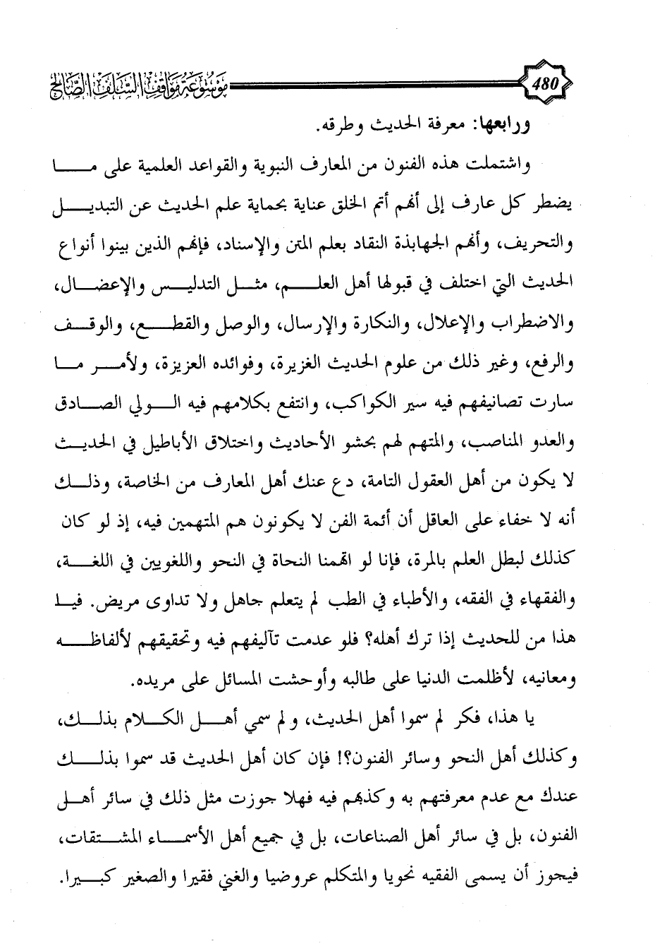 واشتملت هذه الفنون من المعارف النبوية والقواعد العلمية على ما يضطر كل عارف إلى أنهم أتم الخلق عناية بحماية علم الحديث عن التبديل والتحريف، وأنهم الجهابذة النقاد بعلم المتن والإسناد، فإنهم الذين بينوا أنواع الحديث التي اختلف في قبولها أهل العلم، مثل التدليس والإعضال، والاضطراب والإعلال، والنكارة والإرسال، والوصل والقطع، والوقف والرفع، وغير ذلك من علوم الحديث الغزيرة، وفوائده العزيزة، ولأمر ما سارت تصانيفهم فيه سير الكواكب، وانتفع بكلامهم فيه الولي الصادق والعدو المناصب، والمتهم لهم بحشو الأحاديث واختلاق الأباطيل في الحديث لا يكون من أهل العقول التامة، دع عنك أهل المعارف من الخاصة، وذلك أنه لا خفاء على العاقل أن أئمة الفن لا يكونون هم المتهمين فيه، إذ لو كان كذلك لبطل العلم بالمرة، فإنا لو اتهمنا النحاة في النحو واللغويين في اللغة، والفقهاء في الفقه، والأطباء في الطب لم يتعلم جاهل ولا تداوى مريض. فيا هذا من للحديث إذا ترك أهله؟ فلو عدمت تآليفهم فيه وتحقيقهم لألفاظه ومعانيه، لأظلمت الدنيا على طالبه وأوحشت المسائل على مريده.