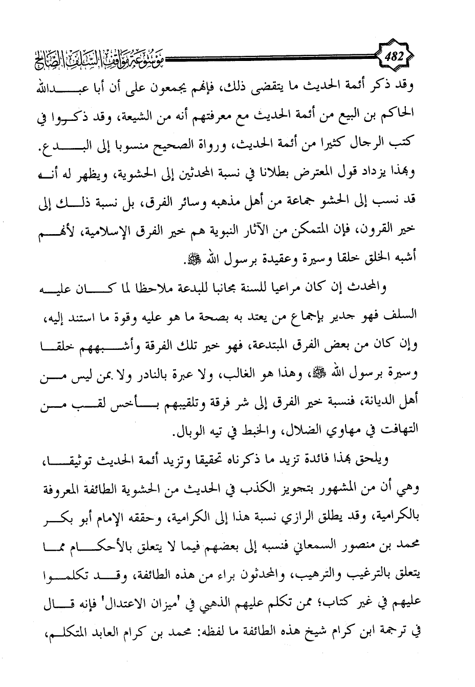 وقد ذكر أئمة الحديث ما يتقضى ذلك، فإنهم يجمعون على أن أبا عبد الله الحاكم بن البيع من أئمة الحديث مع معرفتهم أنه من الشيعة، وقد ذكروا في كتب الرجال كثيرا من أئمة الحديث، ورواة الصحيح منسوبا إلى البدع. وبهذا يزداد قول المعترض بطلانا في نسبة المحدثين إلى الحشوية، ويظهر له أنه قد نسب إلى الحشو جماعة من أهل مذهبه وسائر الفرق، بل نسبة ذلك إلى خير القرون، فإن المتمكن من الآثار النبوية هم خير الفرق الإسلامية، لأنهم أشبه الخلق خلقا وسيرة وعقيدة برسول الله - صلى الله عليه وسلم -.