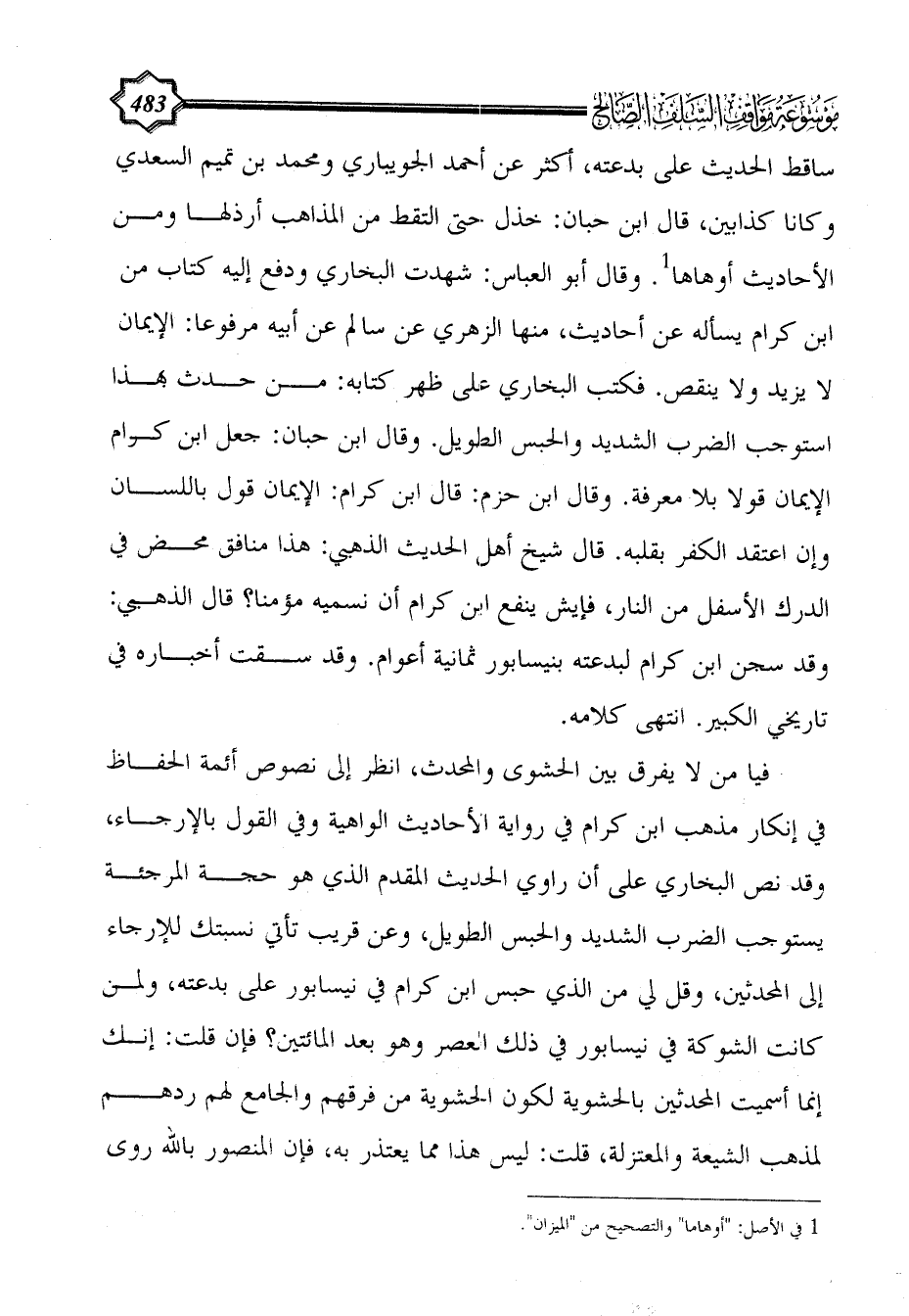 فيا من لا يفرق بين الحشوى والمحدث، انظر إلى نصوص أئمة الحفاظ في إنكار مذهب ابن كرام في رواية الأحاديث الواهية وفي القول بالإرجاء، وقد نص البخاري على أن راوي الحديث المقدم الذي هو حجة المرجئة يستوجب الضرب الشديد والحبس الطويل، وعن قريب تأتي نسبتك للإرجاء إلى المحدثين، وقل لي من الذي حبس ابن كرام في نيسابور على بدعته، ولمن كانت الشوكة في نيسابور في ذلك العصر وهو بعد المائتين؟ فإن قلت: إنك إنما أسميت المحدثين بالحشوية لكون الحشوية من فرقهم والجامع لهم ردهم لمذهب الشيعة والمعتزلة، قلت: ليس هذا مما يعتذر به، فإن المنصور بالله روى