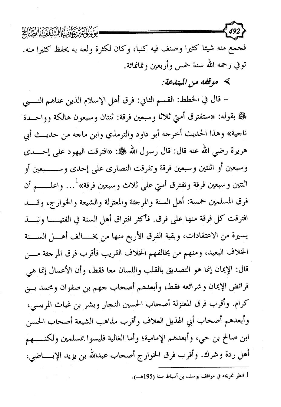 - قال في الخطط: القسم الثاني: فرق أهل الإسلام الذين عناهم النبي - صلى الله عليه وسلم - بقوله: «ستفترق أمتي ثلاثا وسبعين فرقة: ثنتان وسبعون هالكة وواحدة ناجية» وهذا الحديث أخرجه أبو داود والترمذي وابن ماجه من حديث أبي هريرة رضي الله عنه قال: قال رسول الله - صلى الله عليه وسلم -: «افترقت اليهود على إحدى وسبعين أو اثنتين وسبعين فرقة وتفرقت النصارى على إحدى وسبعين أو اثنتين وسبعين فرقة وتفترق أمتي على ثلاث وسبعين فرقة» (¬1) ... واعلم أن فرق المسلمين خمسة: أهل السنة والمرجئة والمعتزلة والشيعة والخوارج، وقد افترقت كل فرقة منها على فرق. فأكثر افتراق أهل السنة في الفتيا ونبذ يسيرة من الاعتقادات، وبقية الفرق الأربع منها من يخالف أهل السنة الخلاف البعيد، ومنهم من يخالفهم الخلاف القريب فأقرب فرق المرجئة من قال: الإيمان إنما هو التصديق بالقلب واللسان معا فقط، وأن الأعمال إنما هي فرائض الإيمان وشرائعه فقط، وأبعدهم أصحاب جهم بن صفوان ومحمد بن كرام. وأقرب فرق المعتزلة أصحاب الحسين النجار وبشر بن غياث المريسي، وأبعدهم أصحاب أبي الهذيل العلاف وأقرب مذاهب الشيعة أصحاب الحسن ابن صالح بن حي، وأبعدهم الإمامية؛ وأما الغالية فليسوا بمسلمين ولكنهم أهل ردة وشرك. وأقرب فرق الخوارج أصحاب عبد الله بن يزيد الإباضي،