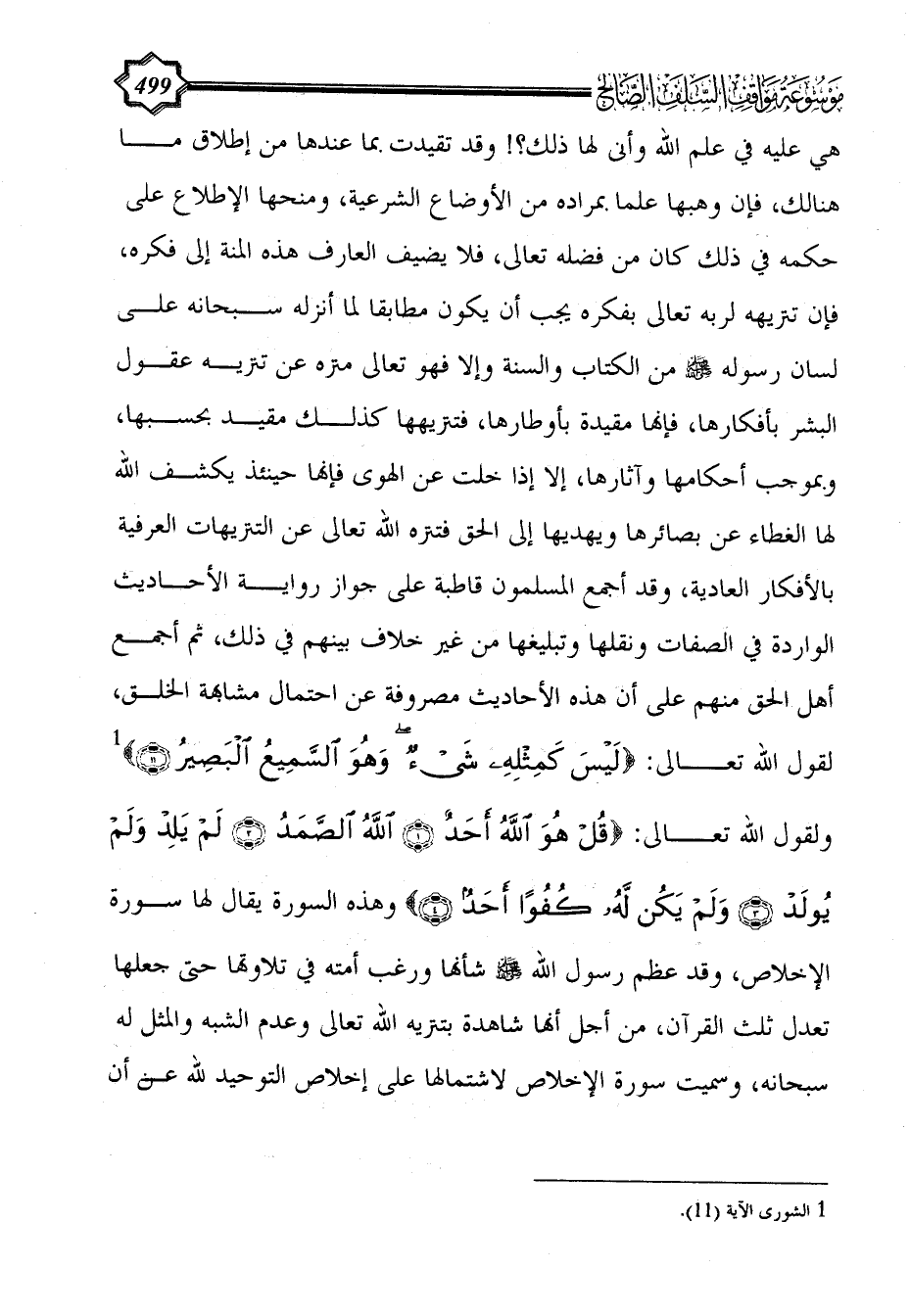 ولقول الله تعالى: {قُلْ هُوَ اللَّهُ أَحَدٌ (1) اللَّهُ الصَّمَدُ (2) لَمْ يَلِدْ وَلَمْ يُولَدْ (3) وَلَمْ يَكُنْ لَهُ كُفُوًا أَحَد (4)} وهذه السورة يقال لها سورة الإخلاص، وقد عظم رسول الله - صلى الله عليه وسلم - شأنها ورغب أمته في تلاوتها حتى جعلها تعدل ثلث القرآن، من أجل أنها شاهدة بتنزيه الله تعالى وعدم الشبه والمثل له سبحانه، وسميت سورة الإخلاص لاشتمالها على إخلاص التوحيد لله عن أن