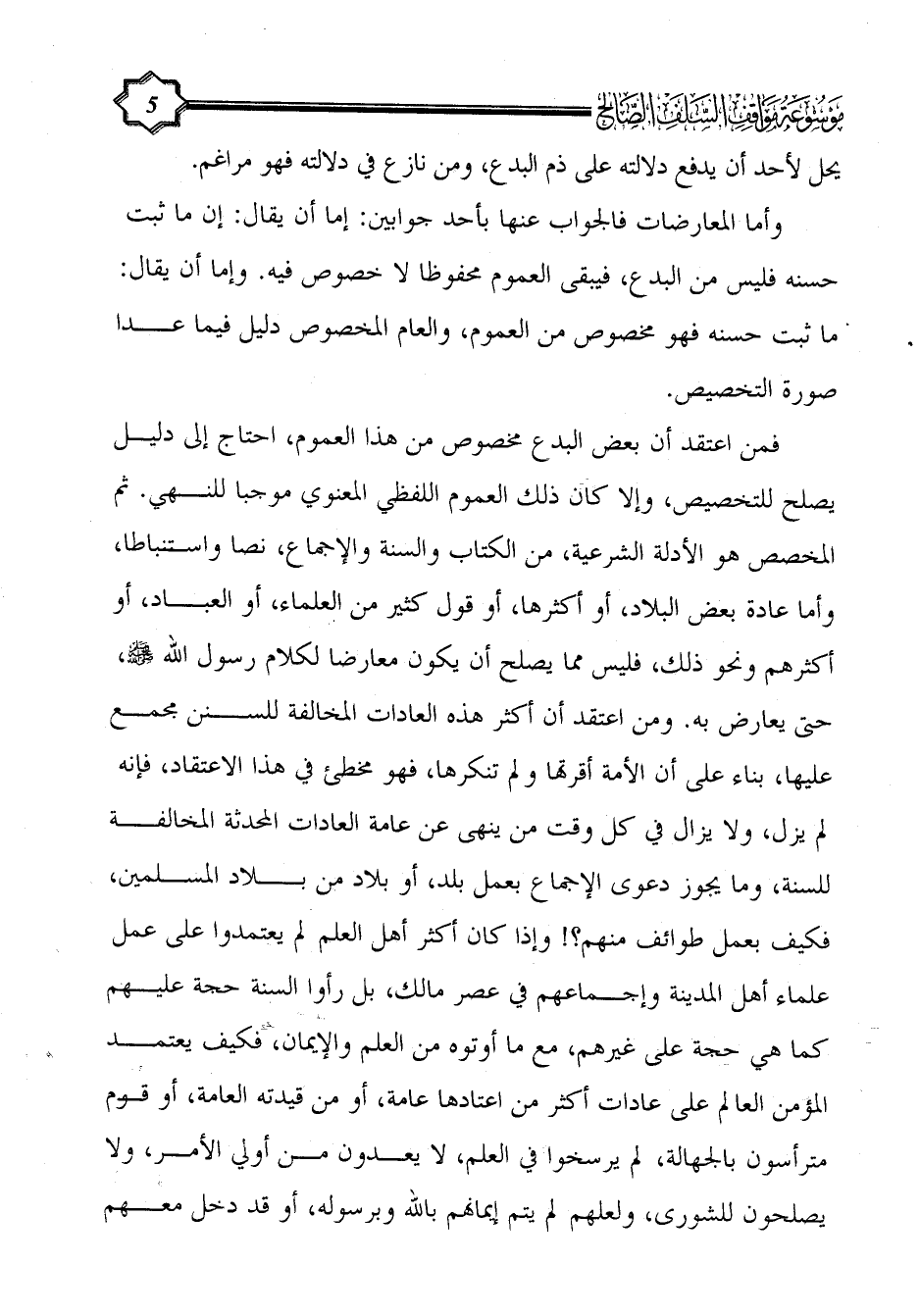 فمن اعتقد أن بعض البدع مخصوص من هذا العموم، احتاج إلى دليل يصلح للتخصيص، وإلا كان ذلك العموم اللفظي المعنوي موجبا للنهي. ثم المخصص هو الأدلة الشرعية، من الكتاب والسنة والإجماع، نصا واستنباطا، وأما عادة بعض البلاد، أو أكثرها، أو قول كثير من العلماء، أو العباد، أو أكثرهم ونحو ذلك، فليس مما يصلح أن يكون معارضا لكلام رسول الله - صلى الله عليه وسلم -، حتى يعارض به. ومن اعتقد أن أكثر هذه العادات المخالفة للسنن مجمع عليها، بناء على أن الأمة أقرتها ولم تنكرها، فهو مخطئ في هذا الاعتقاد، فإنه لم يزل، ولا يزال في كل وقت من ينهى عن عامة العادات المحدثة المخالفة للسنة، وما يجوز دعوى الإجماع بعمل بلد، أو بلاد من بلاد المسلمين، فكيف بعمل طوائف منهم؟! وإذا كان أكثر أهل العلم لم يعتمدوا على عمل علماء أهل المدينة وإجماعهم في عصر مالك، بل رأوا السنة حجة عليهم كما هي حجة على غيرهم، مع ما أوتوه من العلم والإيمان، فكيف يعتمد المؤمن العالم على عادات أكثر من اعتادها عامة، أو من قيدته العامة، أو قوم مترأسون بالجهالة، لم يرسخوا في العلم، لا يعدون من أولي الأمر، ولا يصلحون للشورى، ولعلهم لم يتم إيمانهم بالله وبرسوله، أو قد دخل معهم