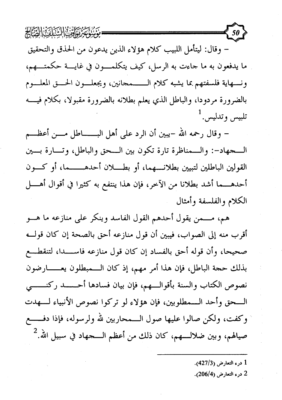 - وقال رحمه الله -يبين أن الرد على أهل الباطل من أعظم الجهاد-: والمناظرة تارة تكون بين الحق والباطل، وتارة بين القولين الباطلين لتبيين بطلانهما، أو بطلان أحدهما، أو كون أحدهما أشد بطلانا من الآخر، فإن هذا ينتفع به كثيرا في أقوال أهل الكلام والفلسفة وأمثالهم، ممن يقول أحدهم القول الفاسد وينكر على منازعه ما هو أقرب منه إلى الصواب، فيبين أن قول منازعه أحق بالصحة إن كان قوله صحيحا، وأن قوله أحق بالفساد إن كان قول منازعه فاسدا، لتنقطع بذلك حجة الباطل، فإن هذا أمر مهم، إذ كان المبطلون يعارضون نصوص الكتاب والسنة بأقوالهم، فإن بيان فسادها أحد ركني الحق وأحد المطلوبين، فإن هؤلاء لو تركوا نصوص الأنبياء لهدت وكفت، ولكن صالوا عليها صول المحاربين لله ولرسوله، فإذا دفع صيالهم، وبين ضلالهم، كان ذلك من أعظم الجهاد في سبيل الله. (¬2)