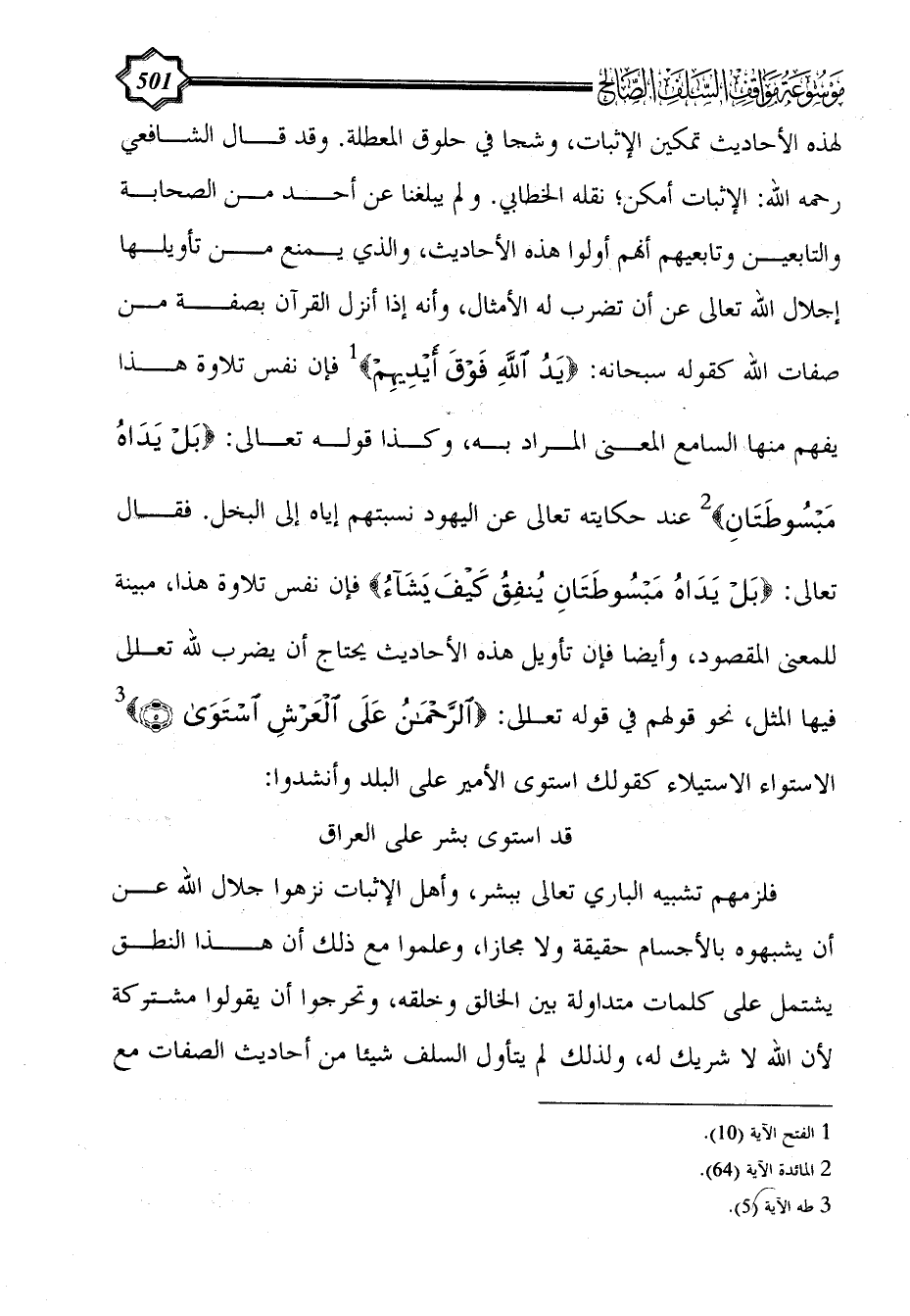 فقال تعالى: {بَلْ يَدَاهُ مَبْسُوطَتَانِ يُنْفِقُ كَيْفَ يَشَاءُ} فإن نفس تلاوة هذا، مبينة للمعنى المقصود، وأيضا فإن تأويل هذه الأحاديث يحتاج أن يضرب لله تعالى فيها المثل، نحو قولهم في قوله تعالى: {الرَّحْمَنُ عَلَى الْعَرْشِ اسْتَوَى (5)} (¬3) الاستواء الاستيلاء كقولك استوى الأمير على البلد وأنشدوا: