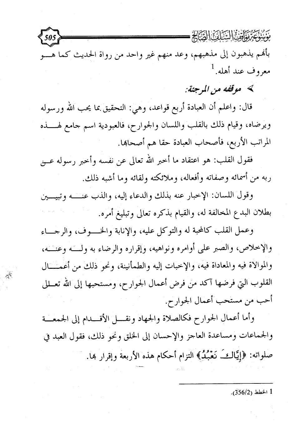 وأما أعمال الجوارح فكالصلاة والجهاد ونقل الأقدام إلى الجمعة والجماعات ومساعدة العاجز والإحسان إلى الخلق ونحو ذلك، فقول العبد في صلواته: {إِيَّاكَ نَعْبُدُ} التزام أحكام هذه الأربعة وإقرار بها.