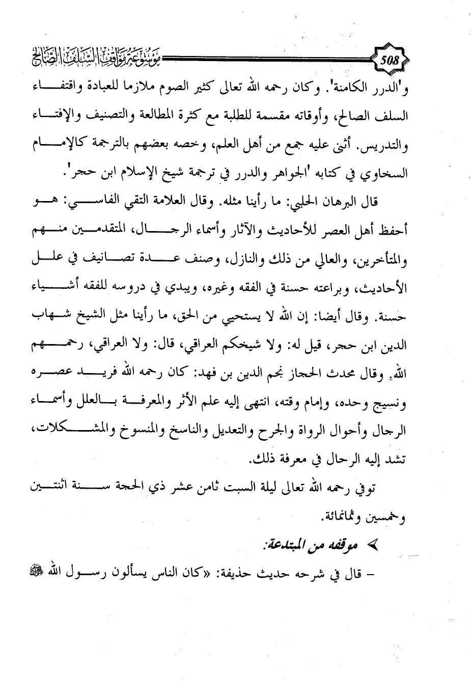 و'الدرر الكامنة'. وكان رحمه الله تعالى كثير الصوم ملازما للعبادة واقتفاء السلف الصالح، وأوقاته مقسمة للطلبة مع كثرة المطالعة والتصنيف والإفتاء والتدريس. أثنى عليه جمع من أهل العلم، وخصه بعضهم بالترجمة كالإمام السخاوي في كتابه 'الجواهر والدرر في ترجمة شيخ الإسلام ابن حجر'.
