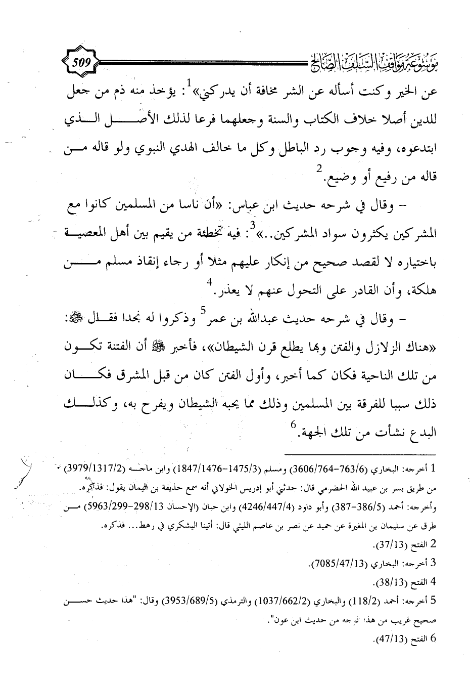 عن الخير وكنت أسأله عن الشر مخافة أن يدركني» (¬1): يؤخذ منه ذم من جعل للدين أصلا خلاف الكتاب والسنة وجعلهما فرعا لذلك الأصل الذي ابتدعوه، وفيه وجوب رد الباطل وكل ما خالف الهدي النبوي ولو قاله من قاله من رفيع أو وضيع. (¬2)