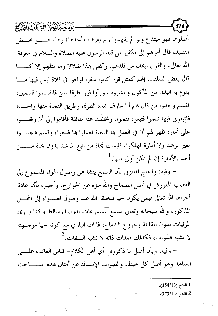 أصلوها فهو مبتدع ولو لم يفهمها ولم يعرف مأخذها؛ وهذا هو محض التقليد، فآل أمرهم إلى تكفير من قلد الرسول عليه الصلاة والسلام في معرفة الله تعالى، والقول بإيمان من قلدهم. وكفى بهذا ضلالا وما مثلهم إلا كما قال بعض السلف: إنهم كمثل قوم كانوا سفرا فوقعوا في فلاة ليس فيها ما يقوم به البدن من المأكول والمشروب ورأوا فيها طرقا شتى فانقسموا قسمين: فقسم وجدوا من قال لهم أنا عارف بهذه الطرق وطريق النجاة منها واحدة فاتبعوني فيها تنجوا فتبعوه فنجوا، وتخلفت عنه طائفة فأقاموا إلى أن وقفوا على أمارة ظهر لهم أن في العمل بها النجاة فعملوا بها فنجوا، وقسم هجموا بغير مرشد ولا أمارة فهلكوا، فليست نجاة من اتبع المرشد بدون نجاة من أخذ بالأمارة إن لم تكن أولى منها. (¬1)