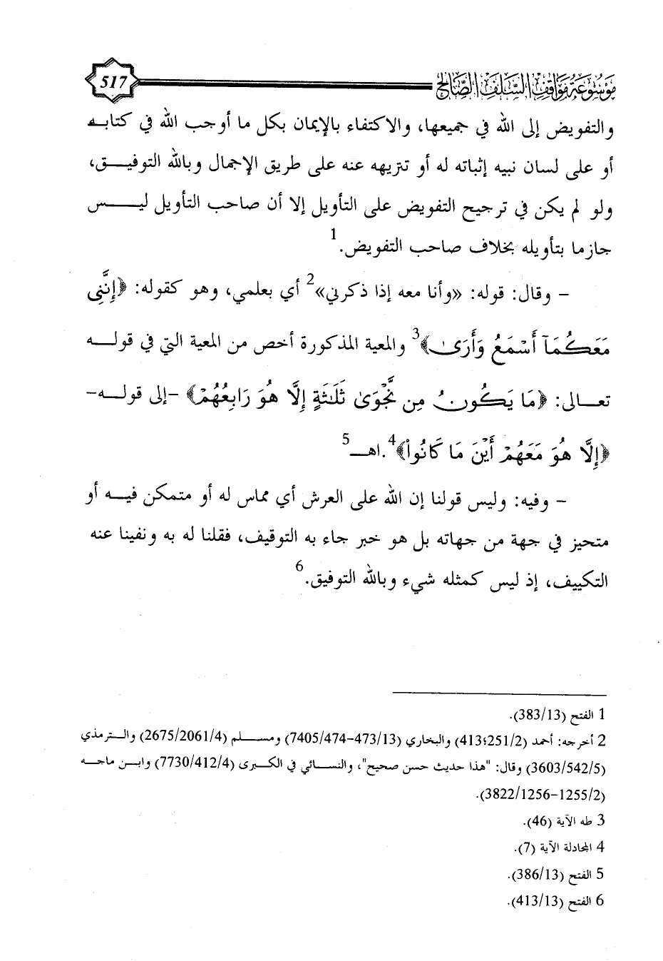 - وفيه: وليس قولنا إن الله على العرش أي مماس له أو متمكن فيه أو متحيز في جهة من جهاته بل هو خبر جاء به التوقيف، فقلنا له به ونفينا عنه التكييف، إذ ليس كمثله شيء وبالله التوفيق. (¬6)