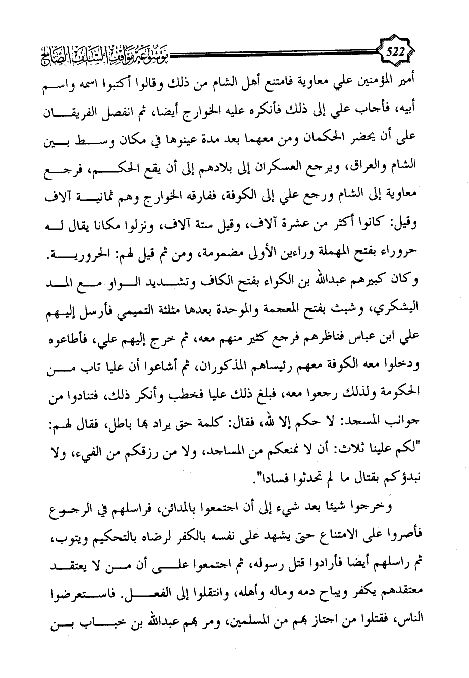 أمير المؤمنين علي معاوية فامتنع أهل الشام من ذلك وقالوا أكتبوا اسمه واسم أبيه، فأجاب علي إلى ذلك فأنكره عليه الخوارج أيضا، ثم انفصل الفريقان على أن يحضر الحكمان ومن معهما بعد مدة عينوها في مكان وسط بين الشام والعراق، ويرجع العسكران إلى بلادهم إلى أن يقع الحكم، فرجع معاوية إلى الشام ورجع علي إلى الكوفة، ففارقه الخوارج وهم ثمانية آلاف وقيل: كانوا أكثر من عشرة آلاف، وقيل ستة آلاف، ونزلوا مكانا يقال له حروراء بفتح المهملة وراءين الأولى مضمومة، ومن ثم قيل لهم: الحرورية.