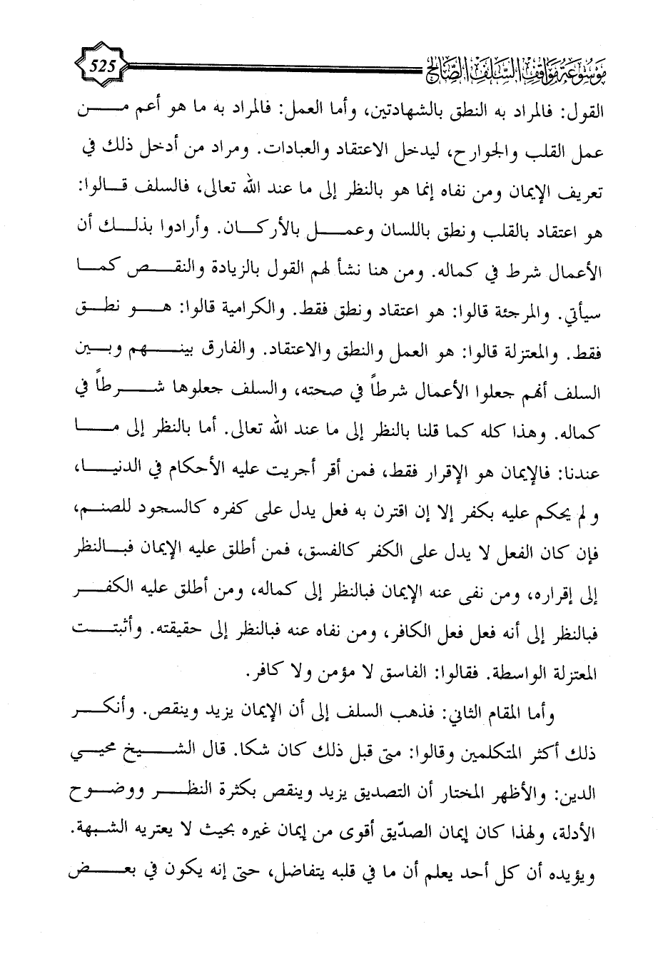 وأما المقام الثاني: فذهب السلف إلى أن الإيمان يزيد وينقص. وأنكر ذلك أكثر المتكلمين وقالوا: متى قبل ذلك كان شكا. قال الشيخ محيي الدين: والأظهر المختار أن التصديق يزيد وينقص بكثرة النظر ووضوح الأدلة، ولهذا كان إيمان الصدّيق أقوى من إيمان غيره بحيث لا يعتريه الشبهة. ويؤيده أن كل أحد يعلم أن ما في قلبه يتفاضل، حتى إنه يكون في بعض