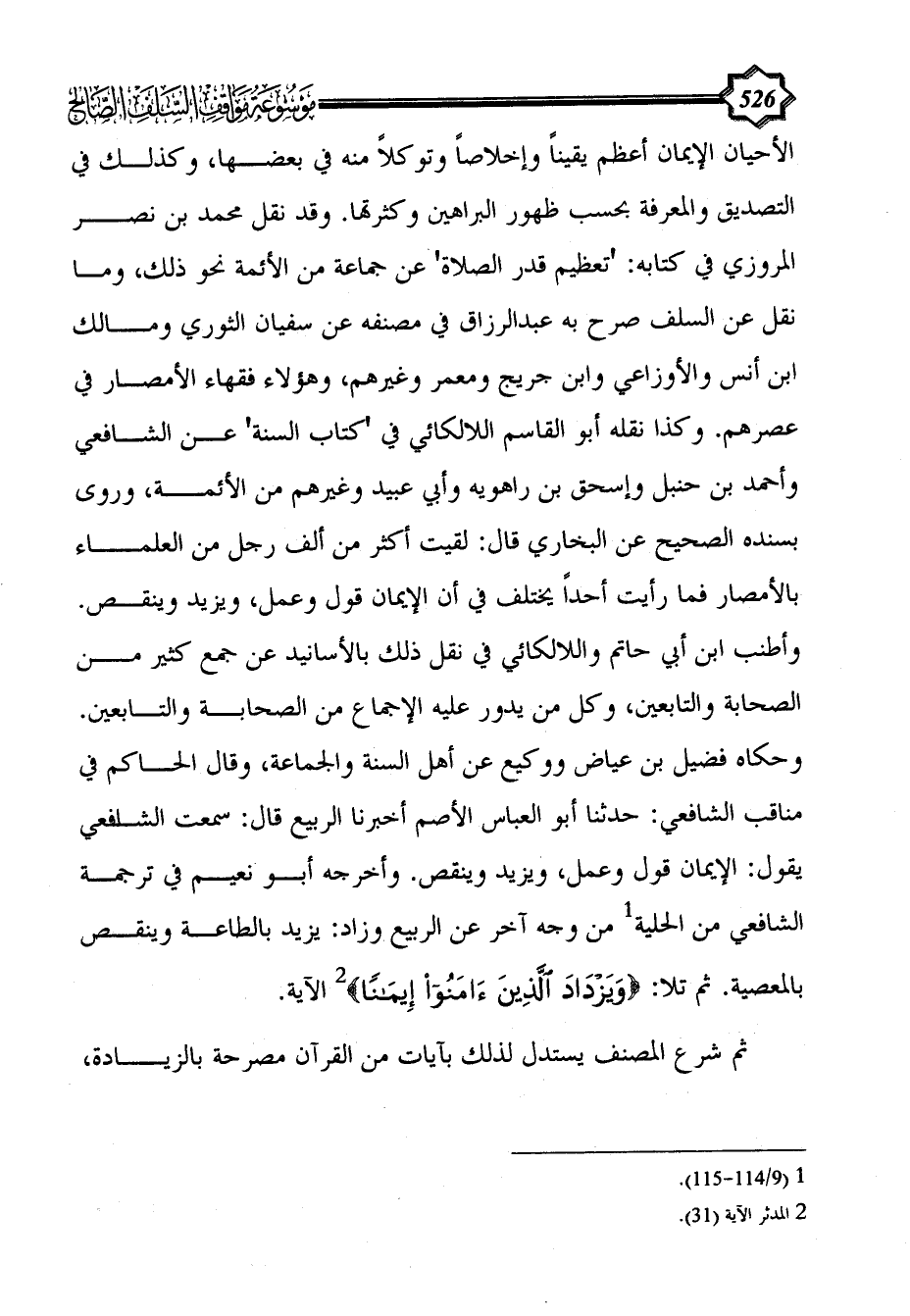 الأحيان الإيمان أعظم يقيناً وإخلاصاً وتوكلاً منه في بعضها، وكذلك في التصديق والمعرفة بحسب ظهور البراهين وكثرتها. وقد نقل محمد بن نصر المروزي في كتابه: 'تعظيم قدر الصلاة' عن جماعة من الأئمة نحو ذلك، وما نقل عن السلف صرح به عبد الرزاق في مصنفه عن سفيان الثوري ومالك ابن أنس والأوزاعي وابن جريج ومعمر وغيرهم، وهؤلاء فقهاء الأمصار في عصرهم. وكذا نقله أبو القاسم اللالكائي في 'كتاب السنة' عن الشافعي وأحمد بن حنبل وإسحق بن راهويه وأبي عبيد وغيرهم من الأئمة، وروى بسنده الصحيح عن البخاري قال: لقيت أكثر من ألف رجل من العلماء بالأمصار فما رأيت أحداً يختلف في أن الإيمان قول وعمل، ويزيد وينقص. وأطنب ابن أبي حاتم واللالكائي في نقل ذلك بالأسانيد عن جمع كثير من الصحابة والتابعين، وكل من يدور عليه الإجماع من الصحابة والتابعين. وحكاه فضيل بن عياض ووكيع عن أهل السنة والجماعة، وقال الحاكم في مناقب الشافعي: حدثنا أبو العباس الأصم أخبرنا الربيع قال: سمعت الشافعي يقول: الإيمان قول وعمل، ويزيد وينقص. وأخرجه أبو نعيم في ترجمة الشافعي من الحلية (¬1) من وجه آخر عن الربيع وزاد: يزيد بالطاعة وينقص بالمعصية. ثم تلا: {وَيَزْدَادَ الَّذِينَ آَمَنُوا إِيمَانًا} (¬2) الآية.