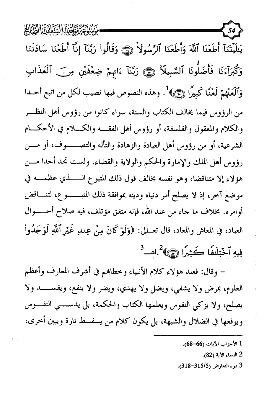 يَا لَيْتَنَا أَطَعْنَا اللَّهَ وَأَطَعْنَا الرَّسُولَا (66) وَقَالُوا رَبَّنَا إِنَّا أَطَعْنَا سَادَتَنَا وَكُبَرَاءَنَا فَأَضَلُّونَا السَّبِيلَا (67) رَبَّنَا آَتِهِمْ ضِعْفَيْنِ مِنَ الْعَذَابِ وَالْعَنْهُمْ لَعْنًا كَبِيرًا (68)} (¬1). وهذه النصوص فيها نصيب لكل من اتبع أحدا من الرؤوس فيما يخالف الكتاب والسنة، سواء كانوا من رؤوس أهل النظر والكلام والمعقول والفلسفة، أو رؤوس أهل الفقه والكلام في الأحكام الشرعية، أو من رؤوس أهل العبادة والزهادة والتأله والتصوف، أو من رؤوس أهل الملك والإمارة والحكم والولاية والقضاء. ولست تجد أحدا من هؤلاء إلا متناقضا، وهو نفسه يخالف قول ذلك المتبوع الذي عظمه في موضع آخر، إذ لا يصلح أمر دنياه ودينه بموافقة ذلك المتبوع، لتناقض أوامره. بخلاف ما جاء من عند الله، فإنه متفق مؤتلف، فيه صلاح أحوال العباد، في المعاش والمعاد، قال تعالى: {وَلَوْ كَانَ مِنْ عِنْدِ غَيْرِ اللَّهِ لَوَجَدُوا فِيهِ اخْتِلَافًا كَثِيرًا (82)} (¬2).اهـ (¬3)