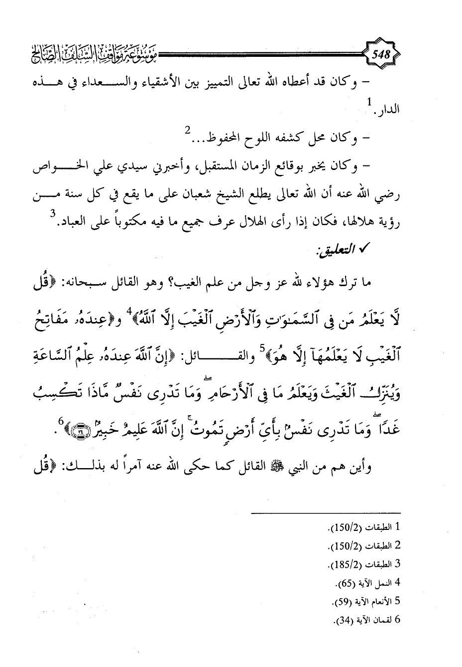 - وكان يخبر بوقائع الزمان المستقبل، وأخبرني سيدي علي الخواص رضي الله عنه أن الله تعالى يطلع الشيخ شعبان على ما يقع في كل سنة من رؤية هلالها، فكان إذا رأى الهلال عرف جميع ما فيه مكتوباً على العباد. (¬3)